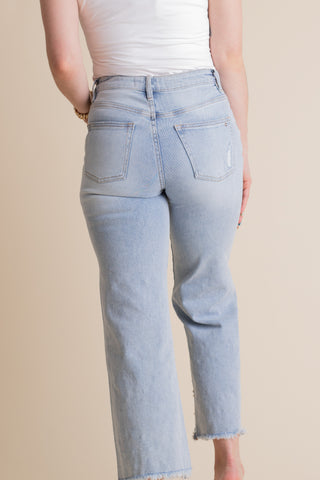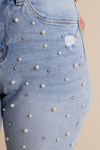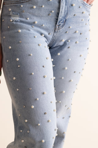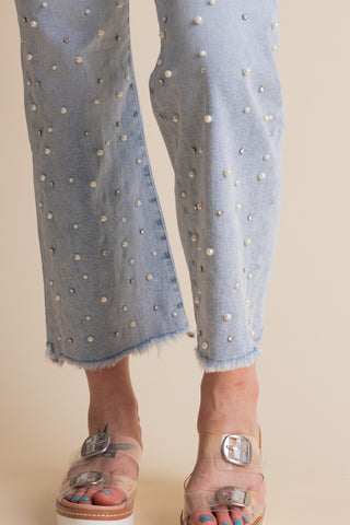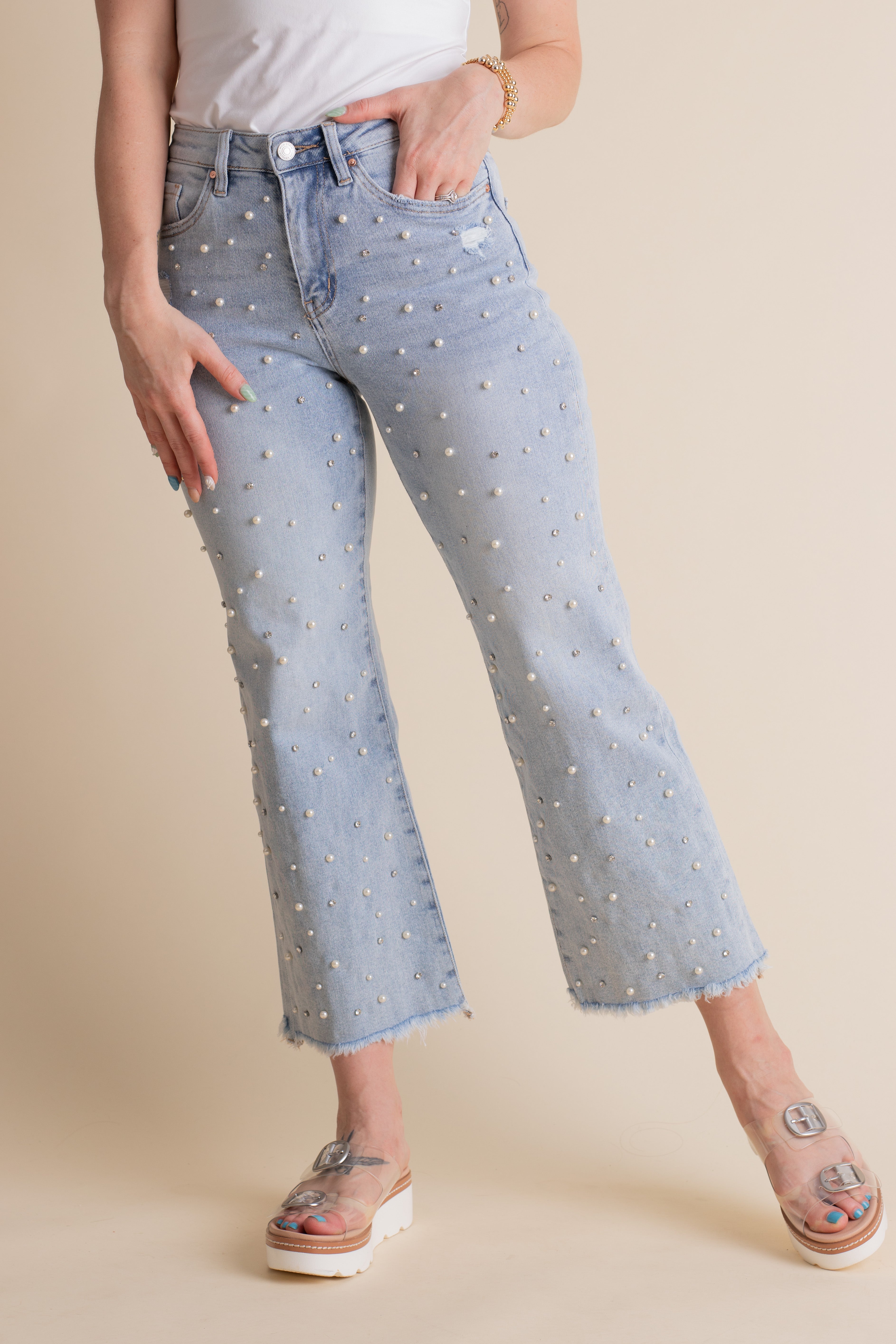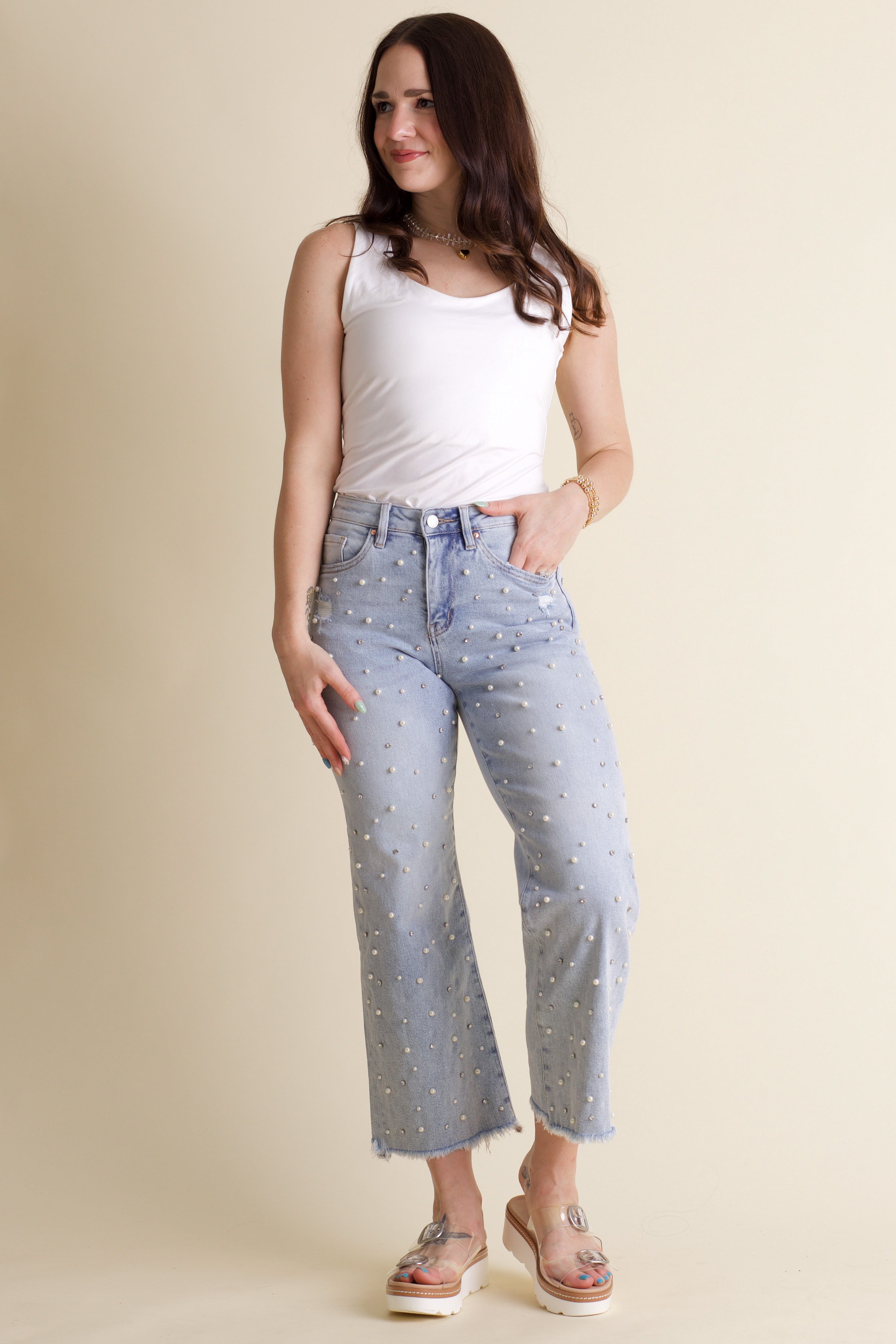 Step out in style with these Baylor High Rise Wide Leg Jeans. Featuring a light wash and a flattering high-rise fit, they offer a breezy, wide-leg silhouette cropped just above the ankle. Sparkle with delicate pearl and rhinestone embellishments that add a fun, playful touch, while the frayed hem keeps the look effortlessly cool and casual. Perfect for turning heads wherever you go! Limited stock and available in sizes 25-32!