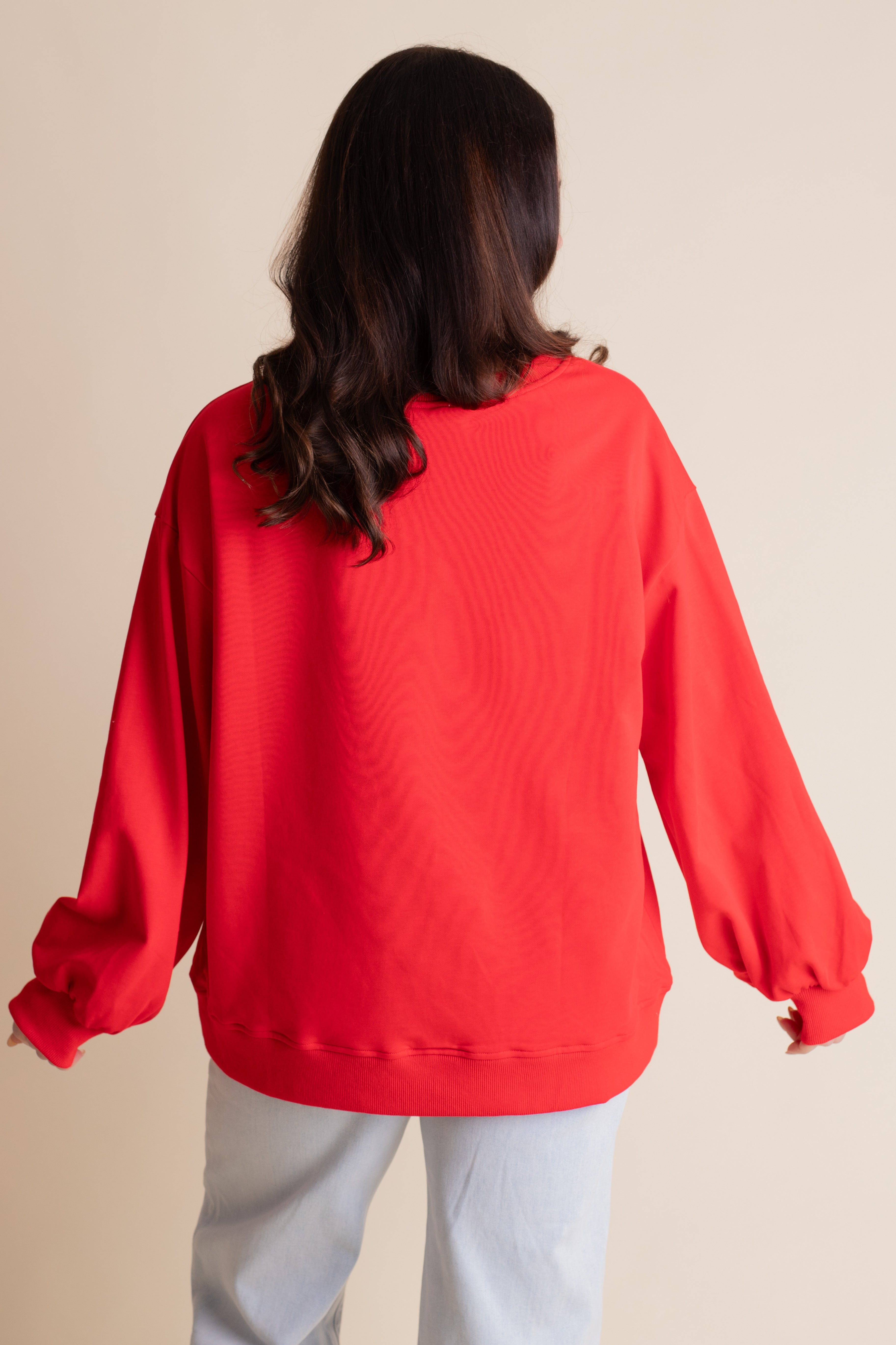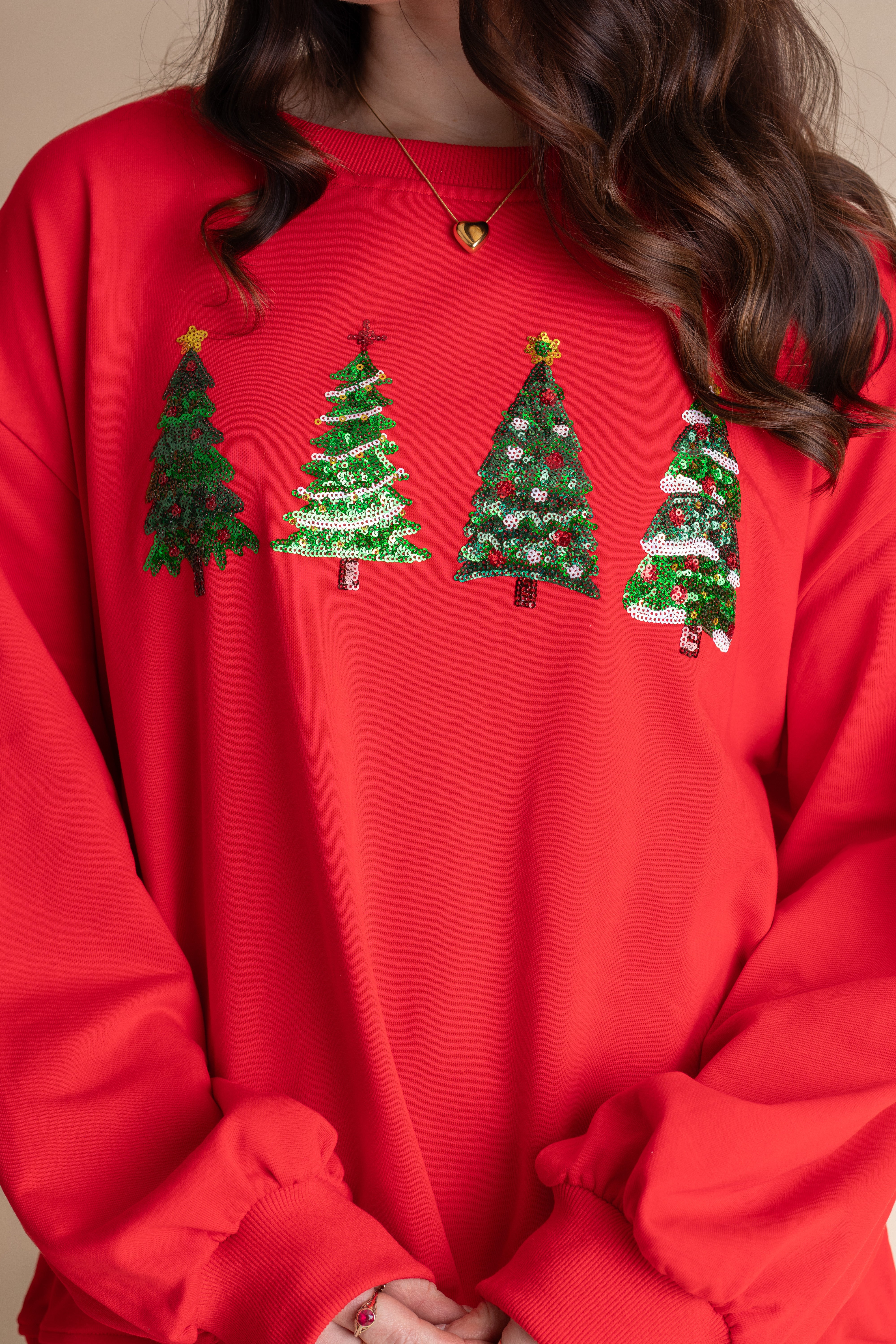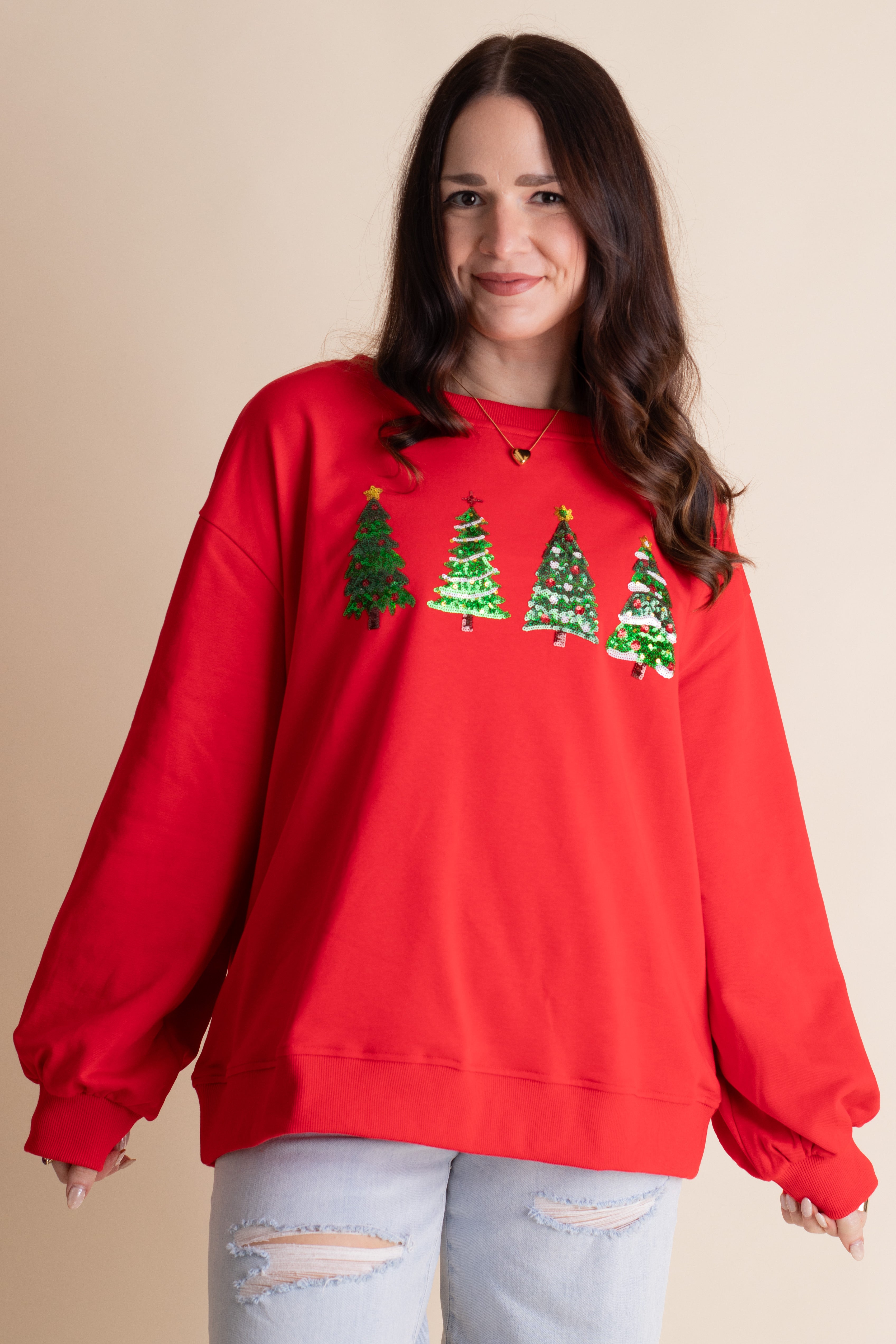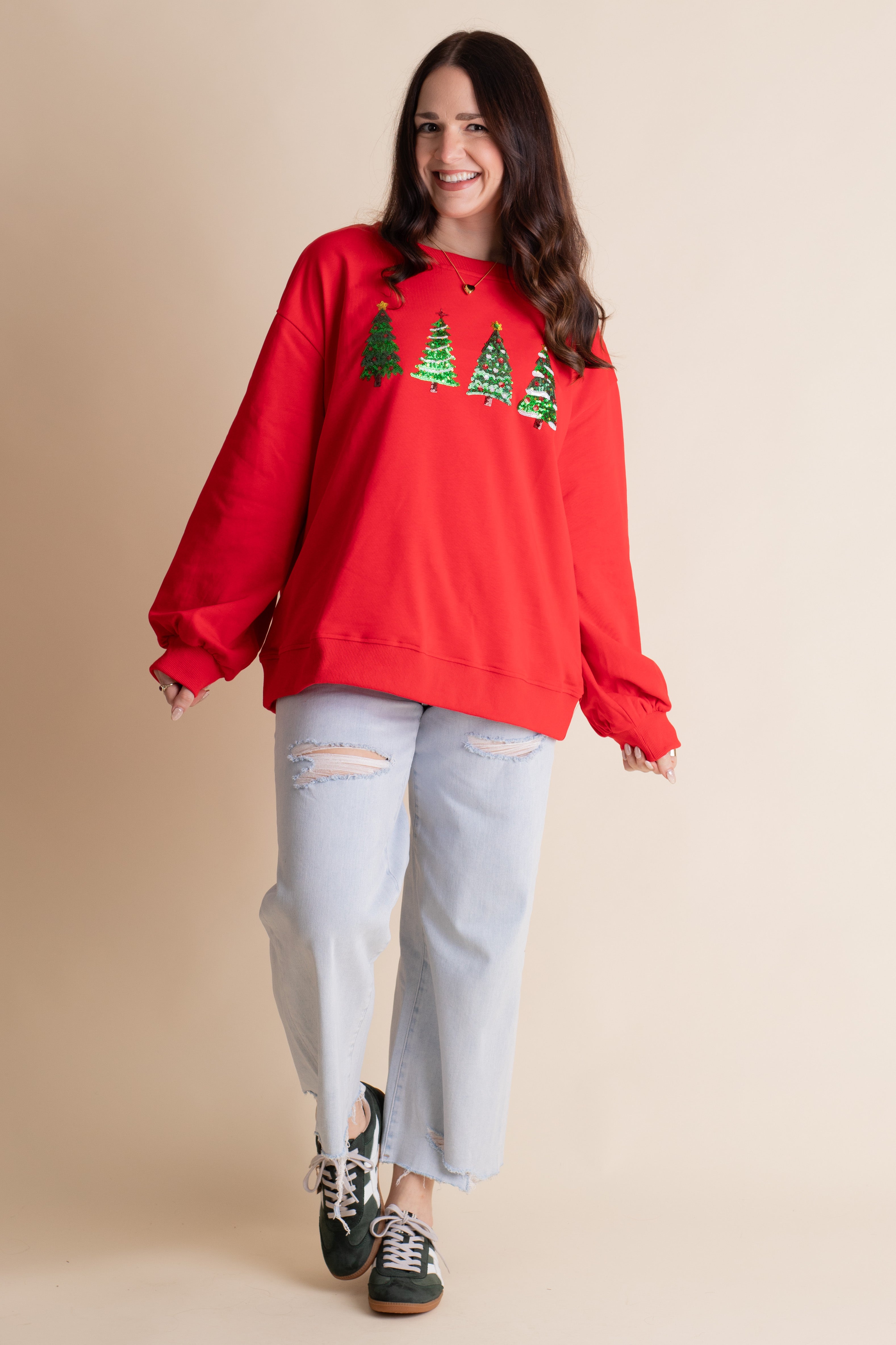 Celebrate the season in style with this playful French Terry sweatshirt featuring sparkling sequin Christmas trees on charming balloon sleeves. Its ribbed trim adds cozy structure, while the oversized fit promises comfort and fun all day long. Perfect for spreading holiday cheer with a festive twist! Limited stock and available in sizes small through large!