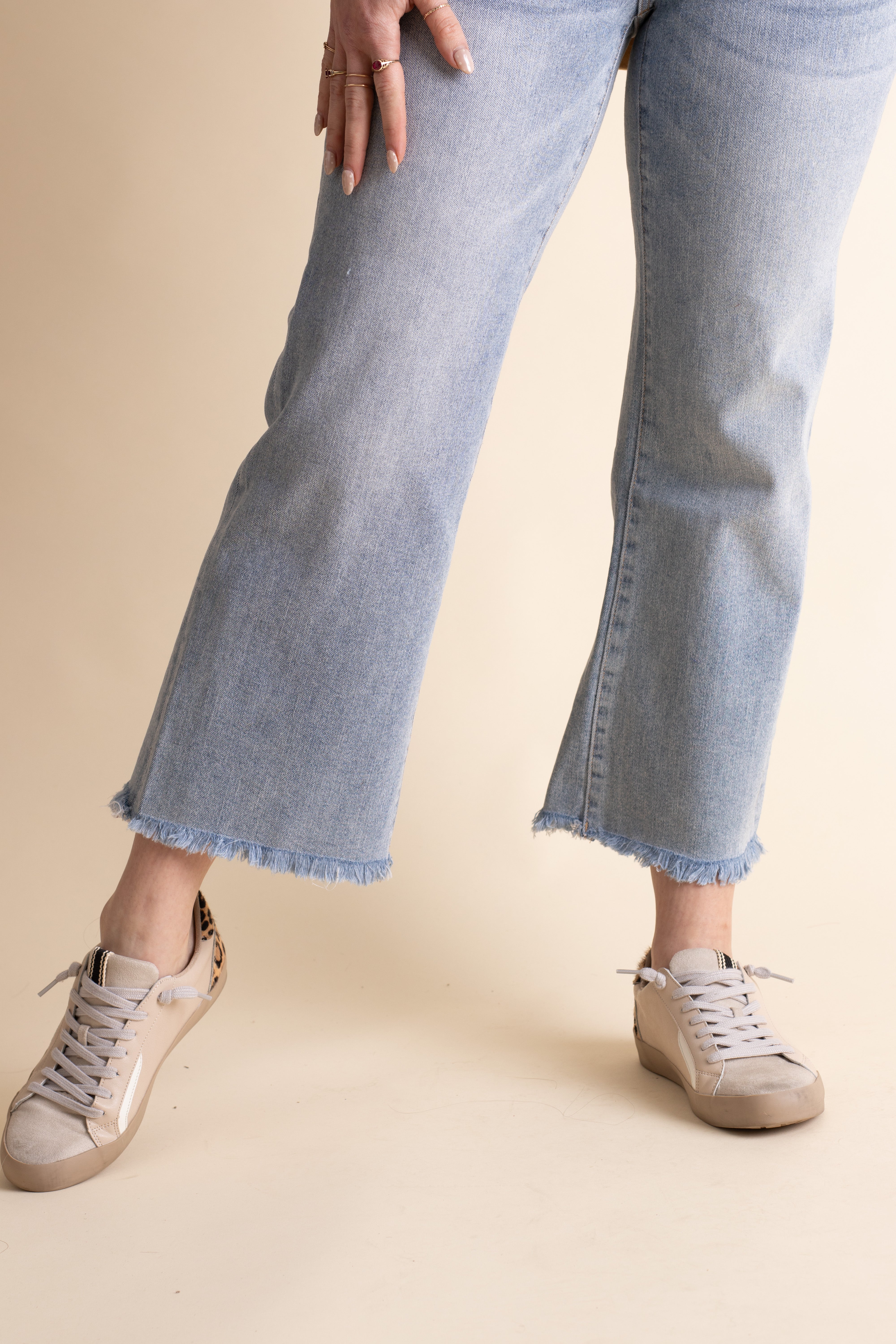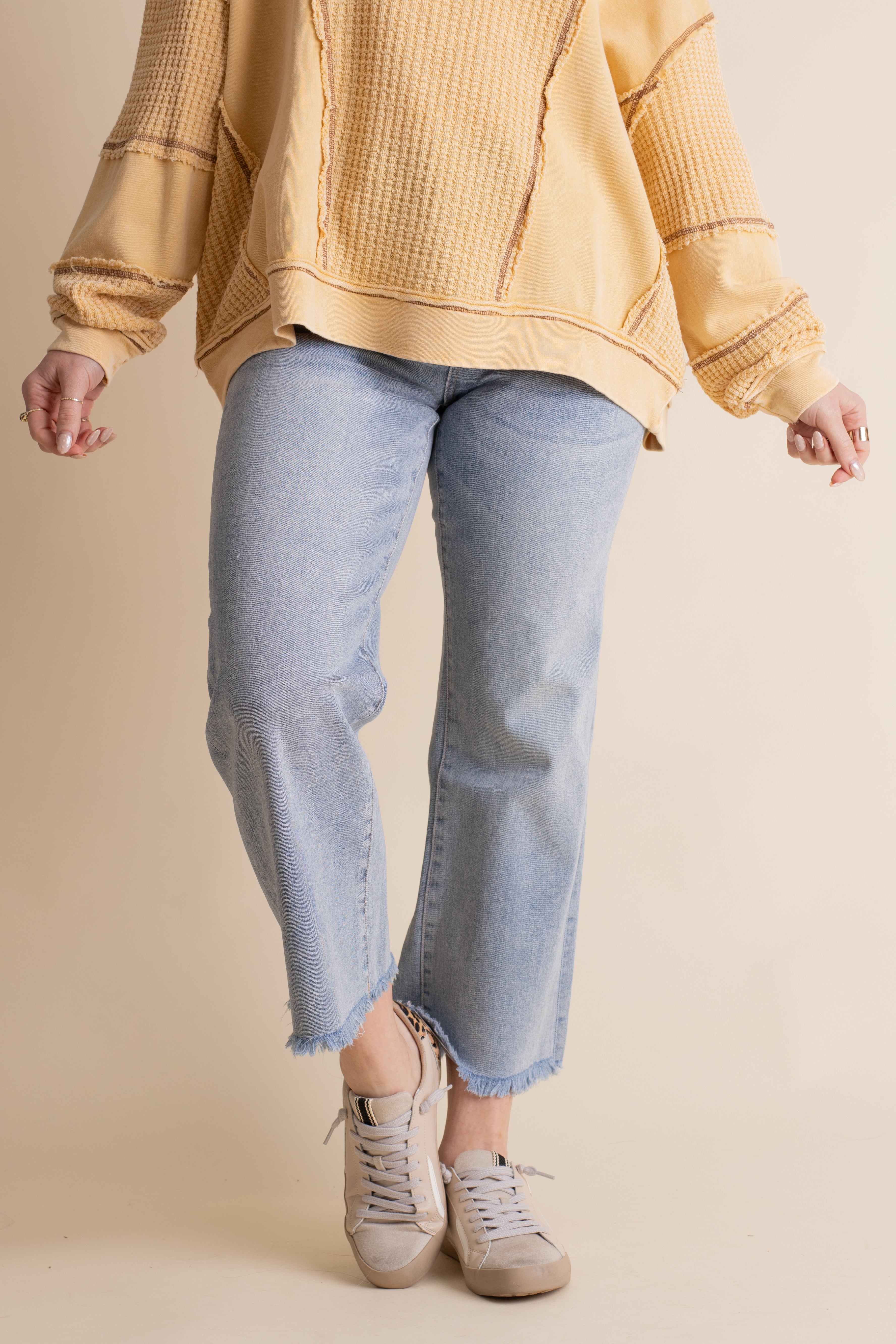 These Courtney High Rise Ankle Wide Leg Jeans bring effortless cool to your wardrobe. With a stretchy fit and medium wash, they offer comfort and style all day long. The slight distressing adds just the right touch of edge, while the frayed cropped hem keeps things playful and trendy. Perfect for pairing with your favorite tees or boots, these jeans are a fun upgrade to your everyday look. Limited stock and available in sizes 25-22W!