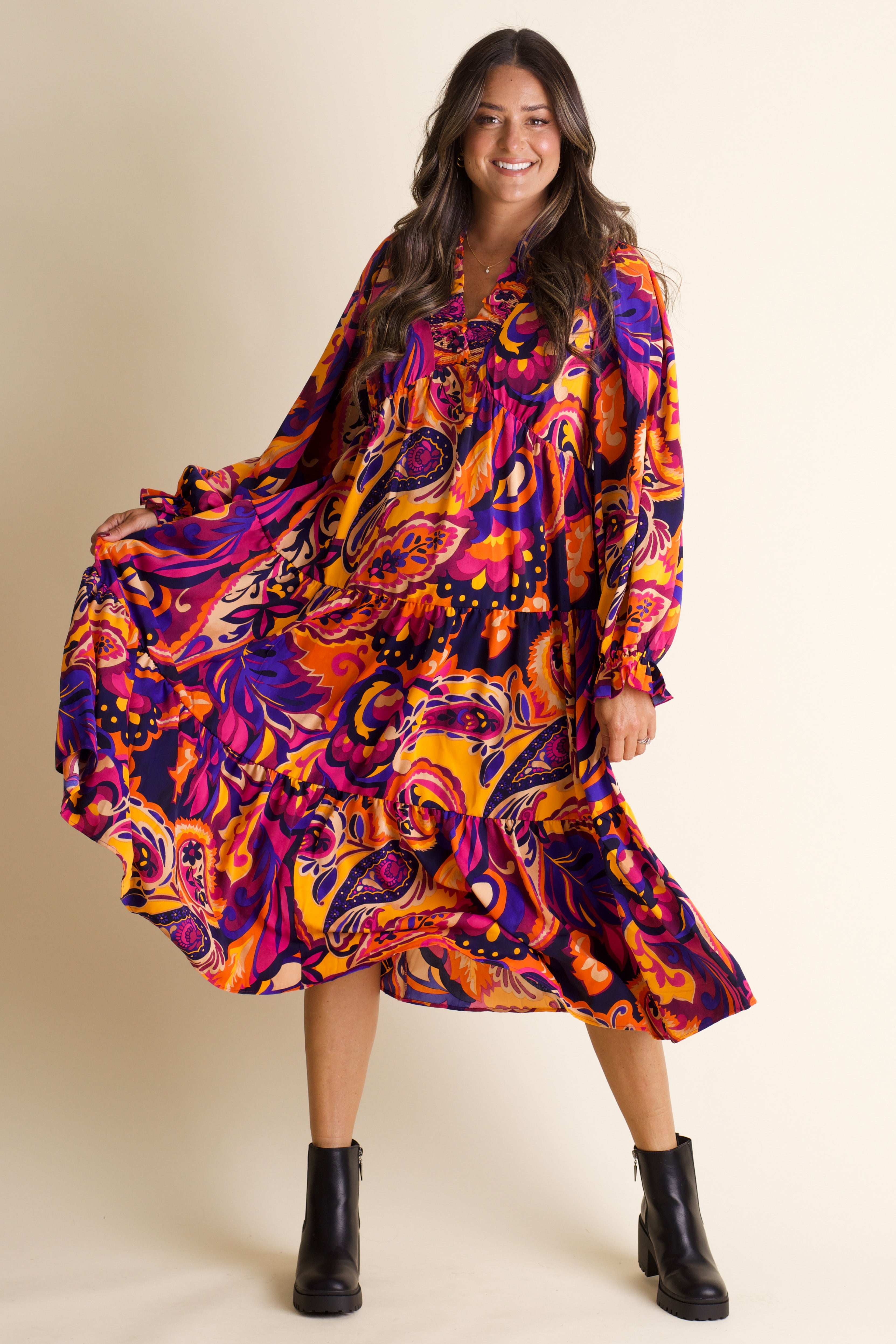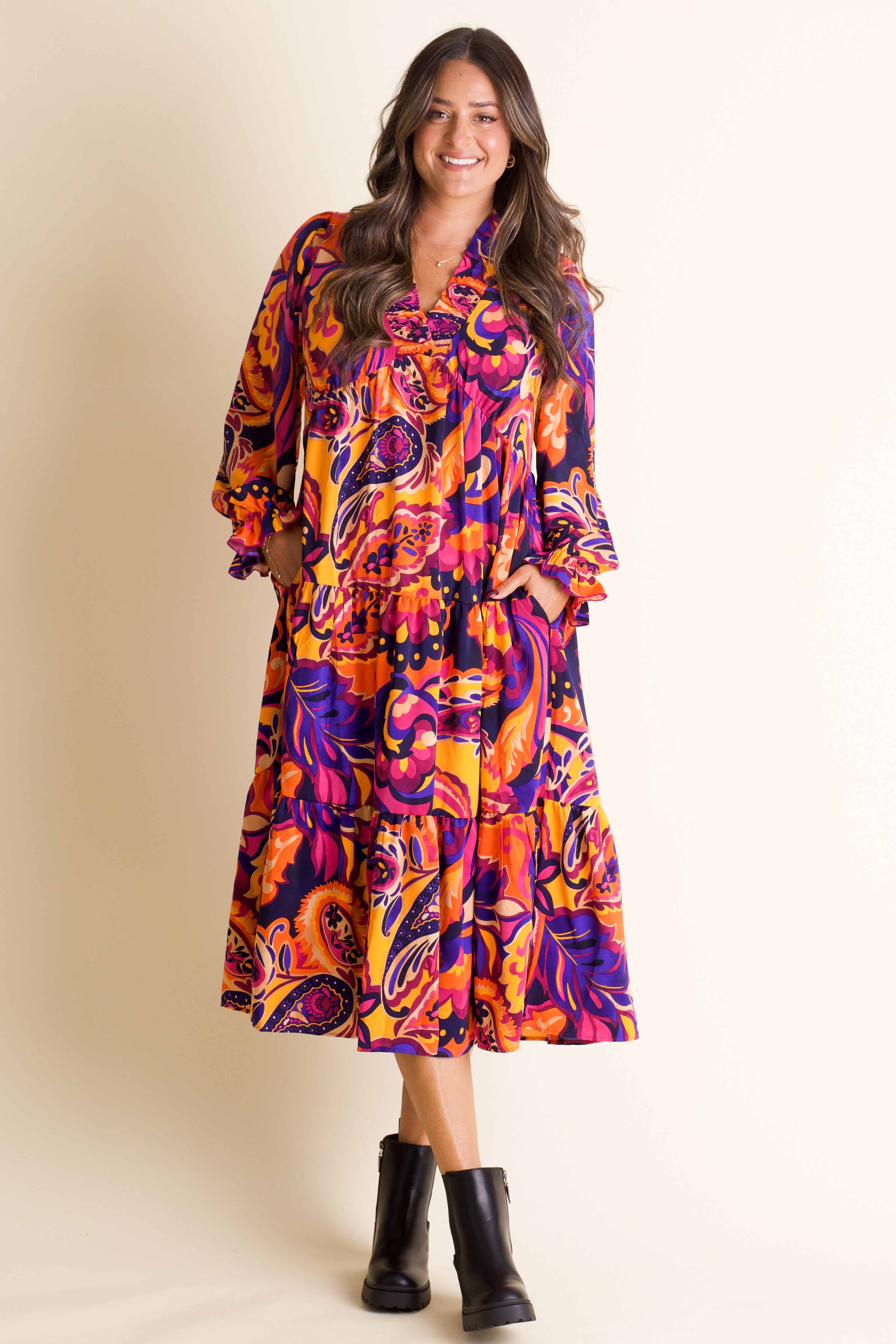 Step into vibrant style with the Creative Cutie Midi Dress. Featuring a bold, colorful abstract print, this dress delights with a smocked V-neckline and charming smocked sleeves. Its flowy fit moves with you, perfect for playful days and lively nights. Embrace fun fashion that feels as good as it looks! Limited stock and available in sizes small through large!