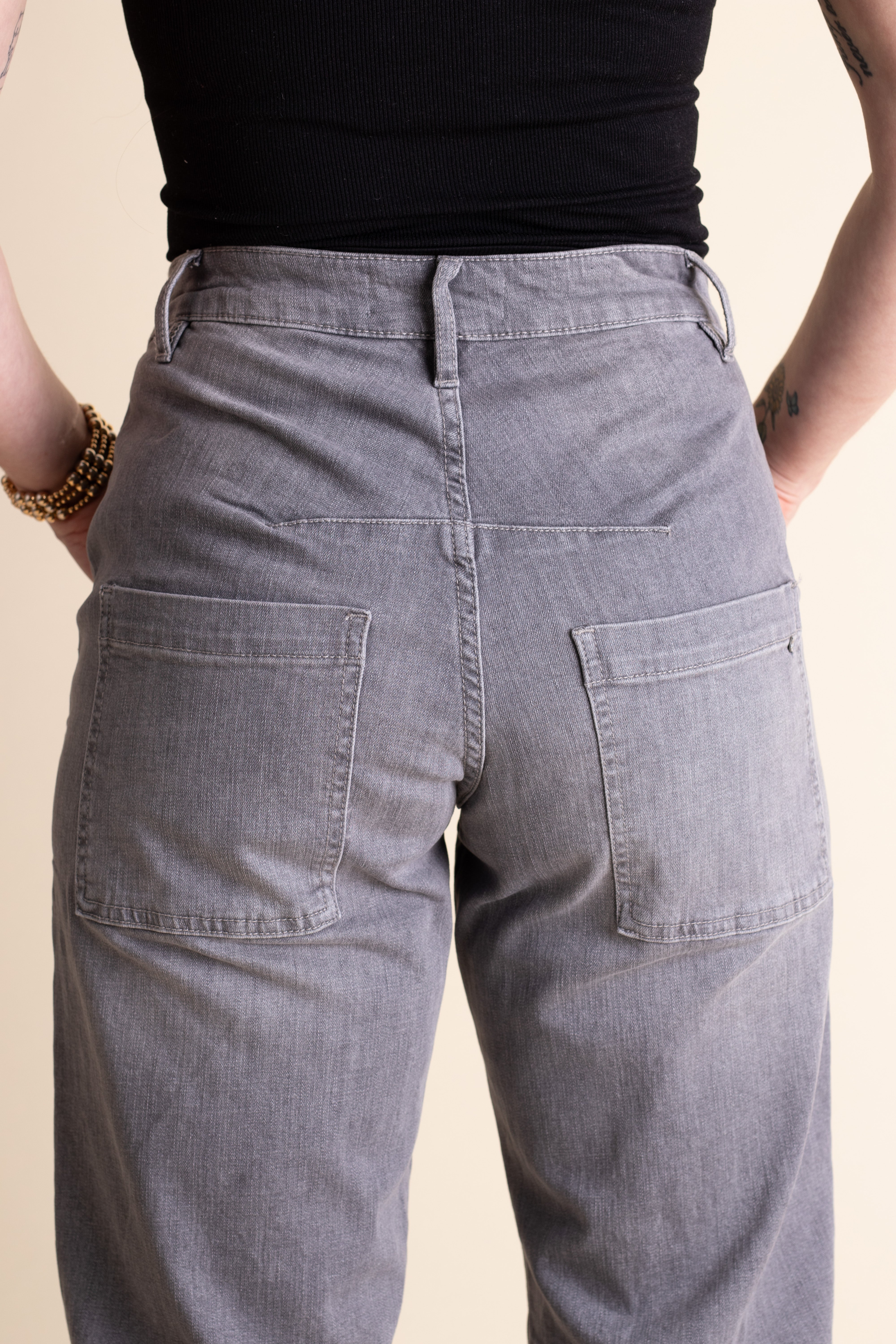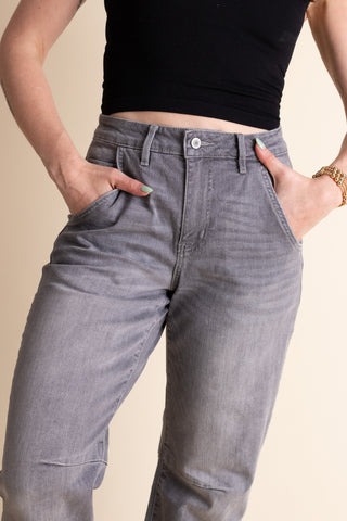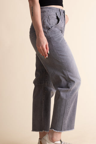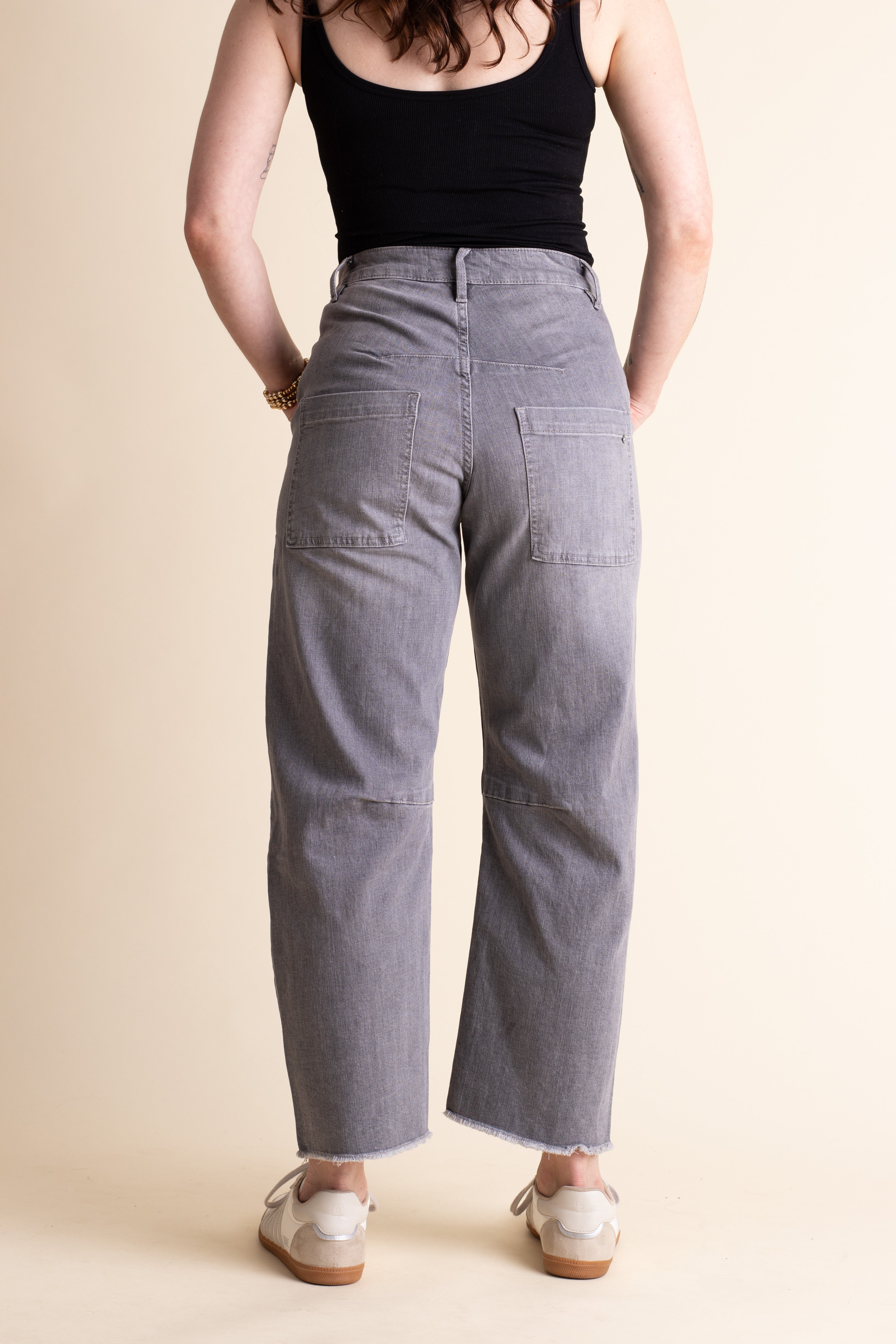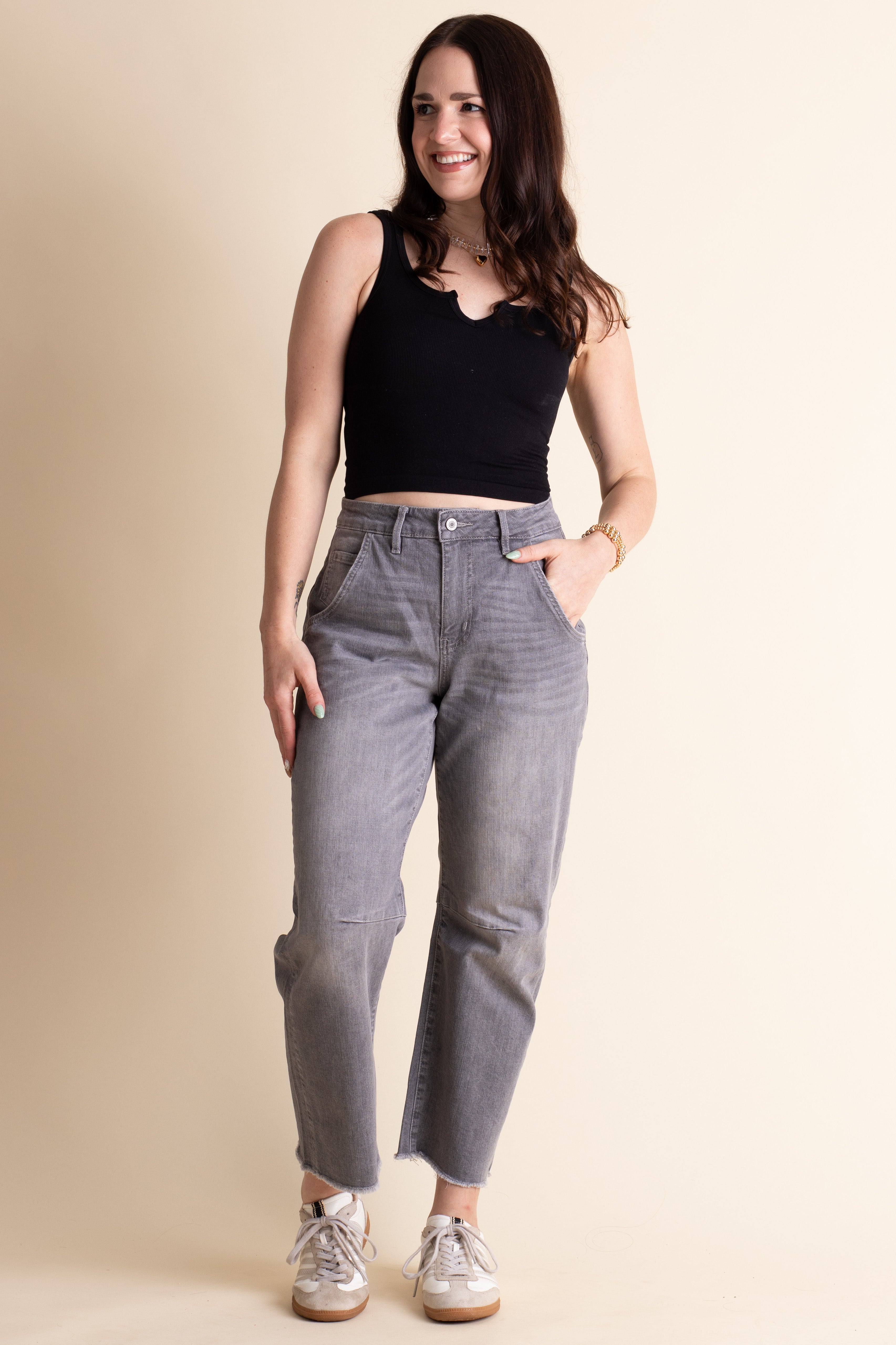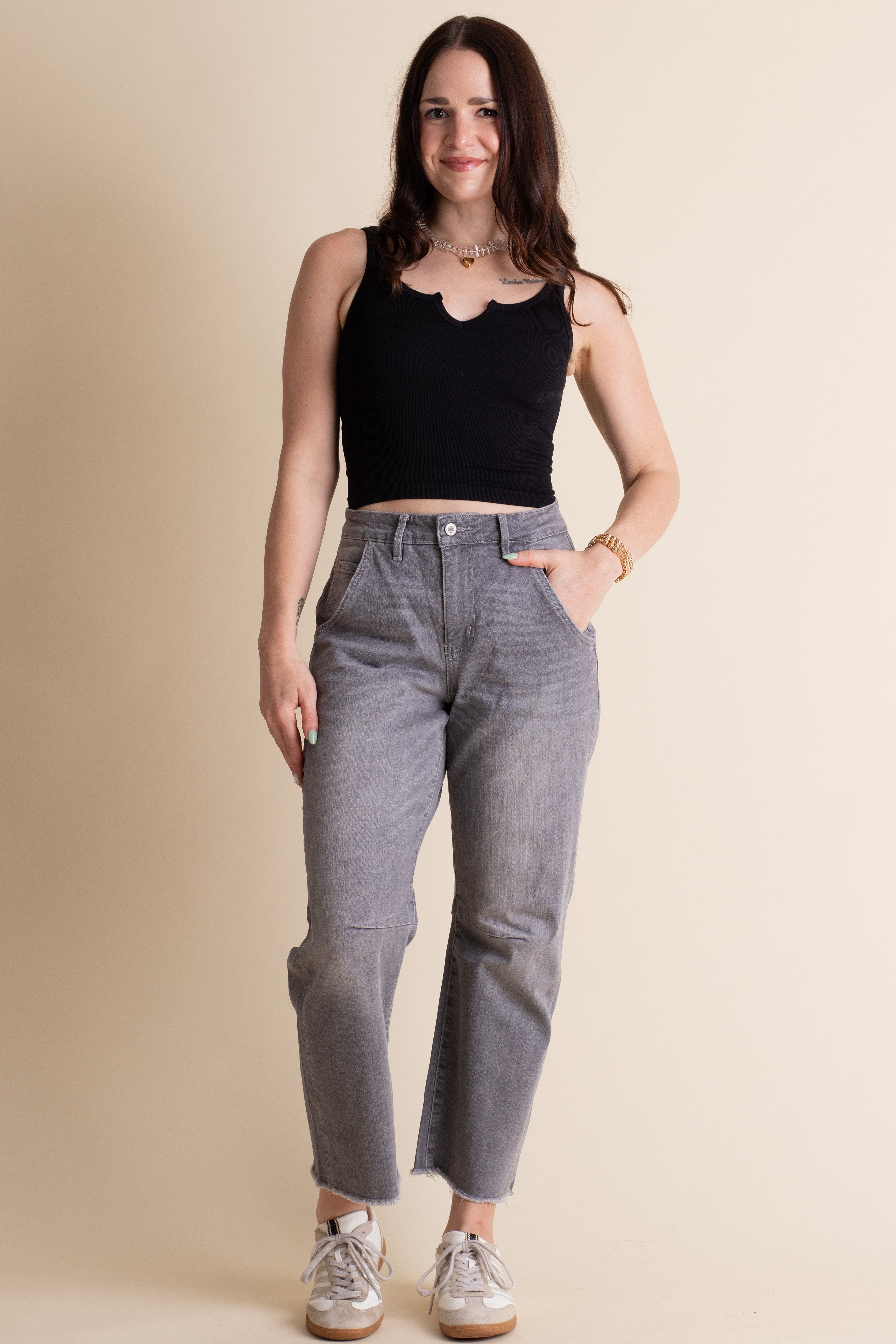 Step into effortless cool with these Harper Super High Rise Barrel Leg Jeans. Featuring a charcoal washed finish and a flattering super high rise, they hug your waist while the barrel leg adds a fun, retro vibe. The cropped raw edge hem gives a cheeky, undone look perfect for showing off your favorite kicks. These jeans are your new go-to for playful style with a laid-back attitude. Limited stock and available in sizes 25-32!