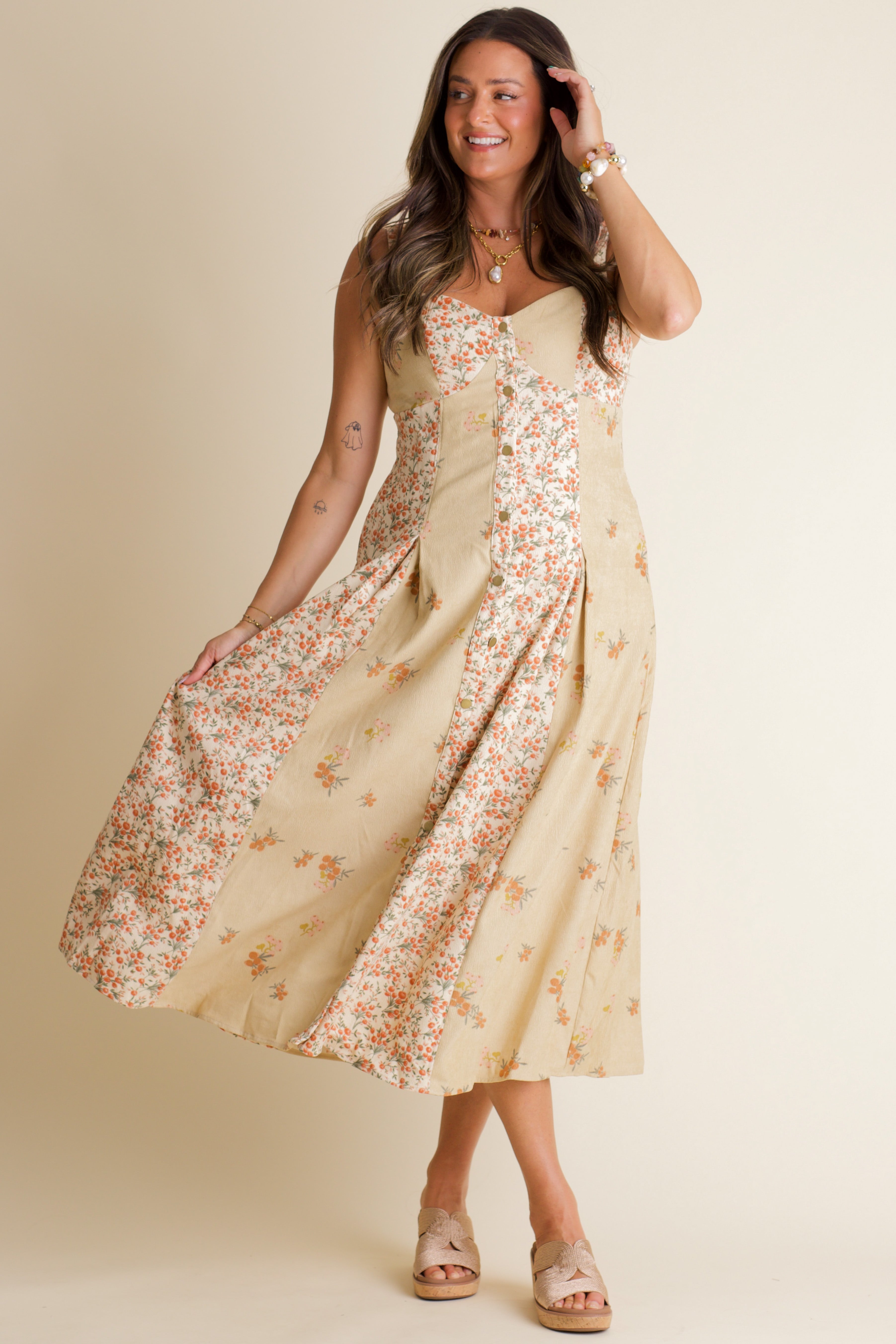Looking for a fun and flirty outfit? This Closet Staple Floral Midi Dress is a must-have! With its corded floral design, button down front, and sweetheart neckline, it's sure to turn heads. The elastic back and pleated front add a touch of comfort and style. Upgrade your wardrobe with this versatile and chic dress! Limited stock and available in sizes small through large!