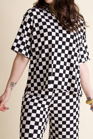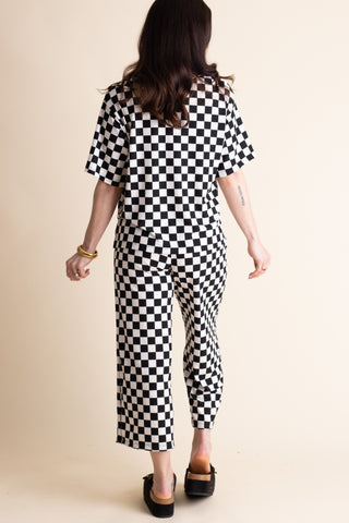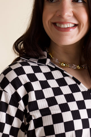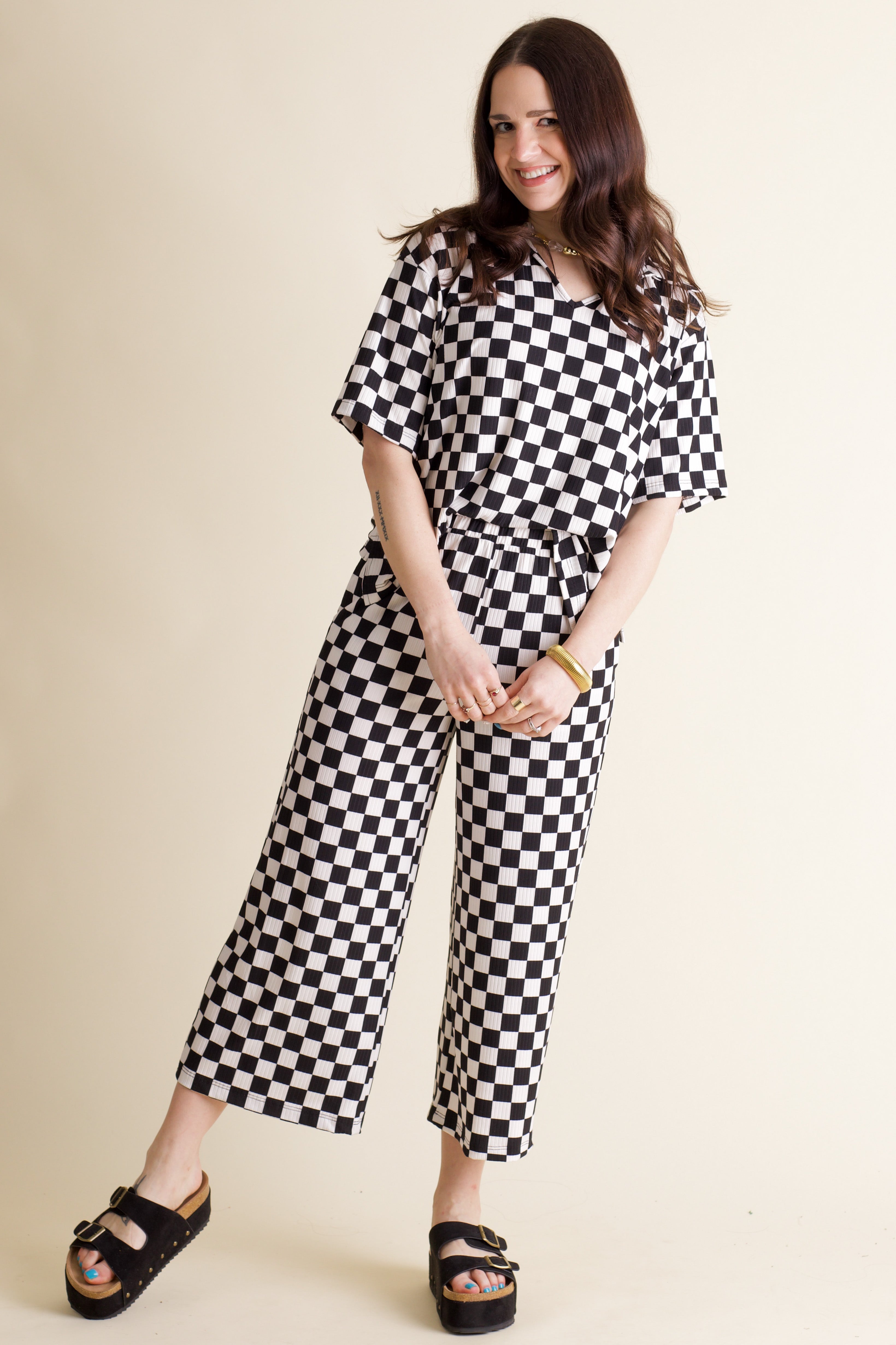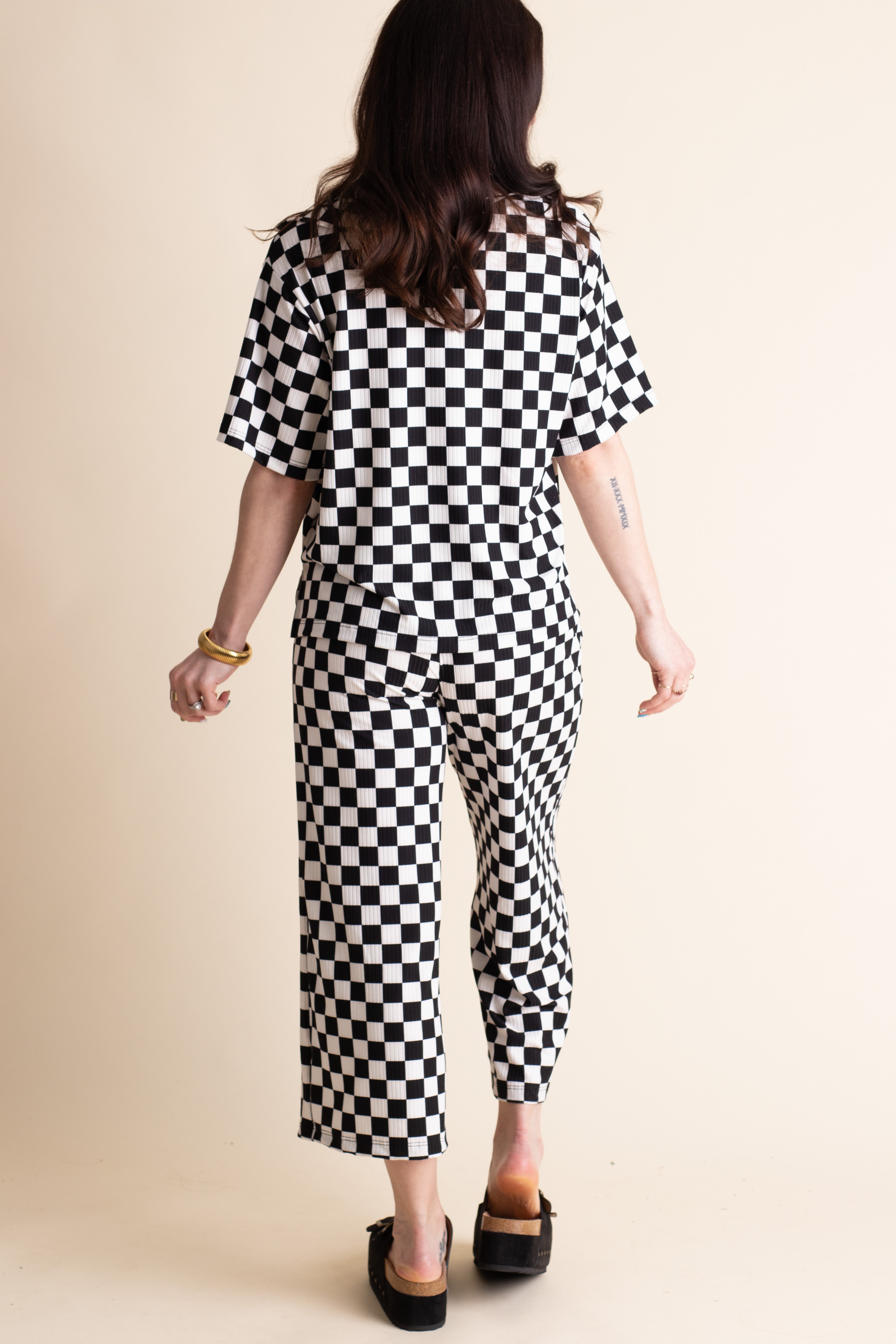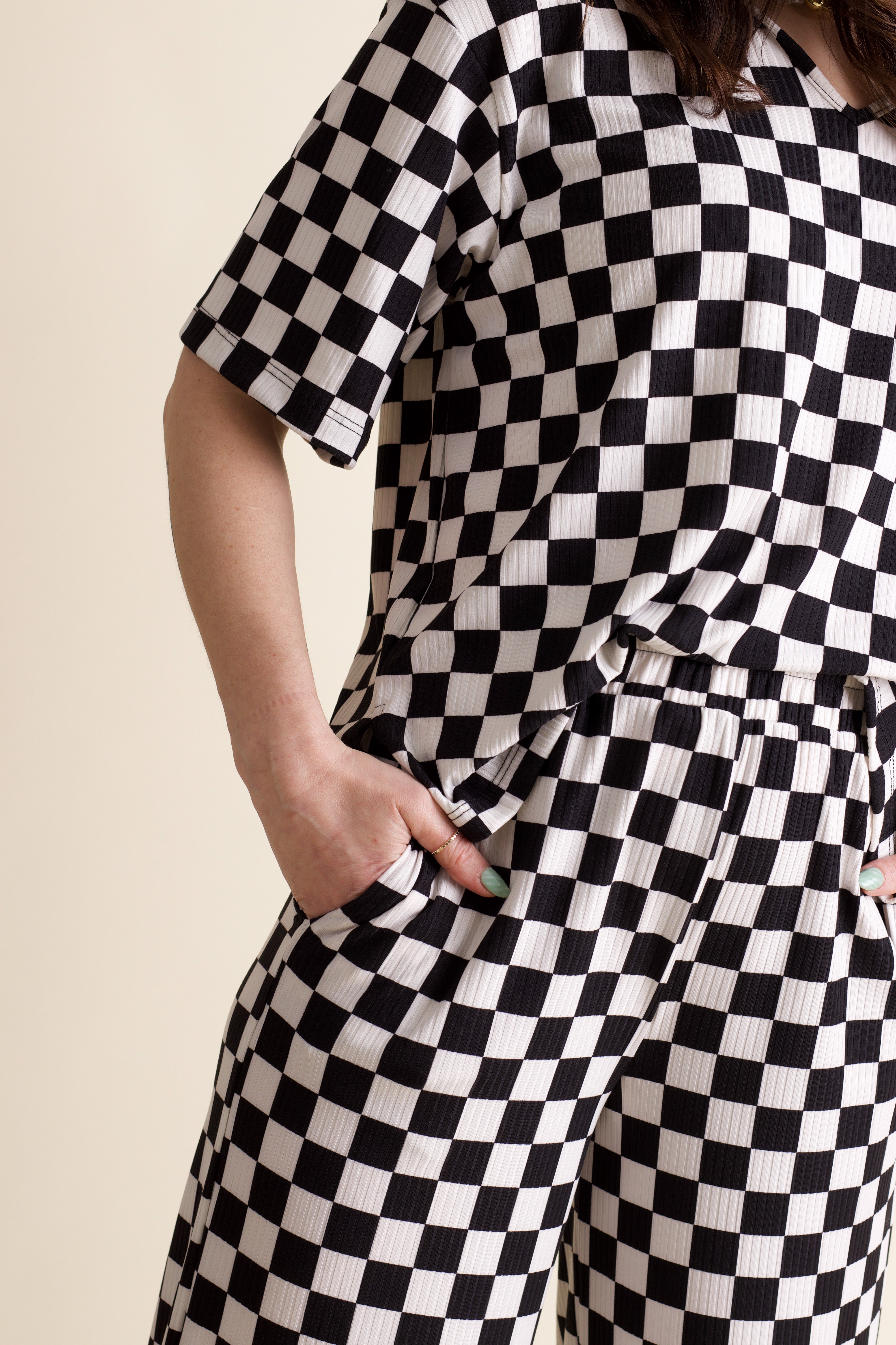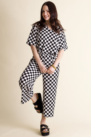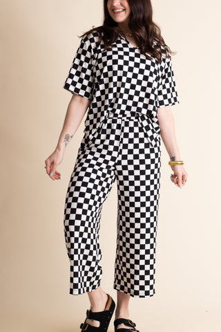 Make a statement with our I Choose You Checkered Set. Ribbed fabric and checkered pattern add a touch of class, while the relaxed fit and side slits keep it comfortable. Complete with a collared neckline and high elastic waist cropped pants with pockets. A versatile and fashionable choice for any occasion. Available in 2 color options and sizes small through XL!
