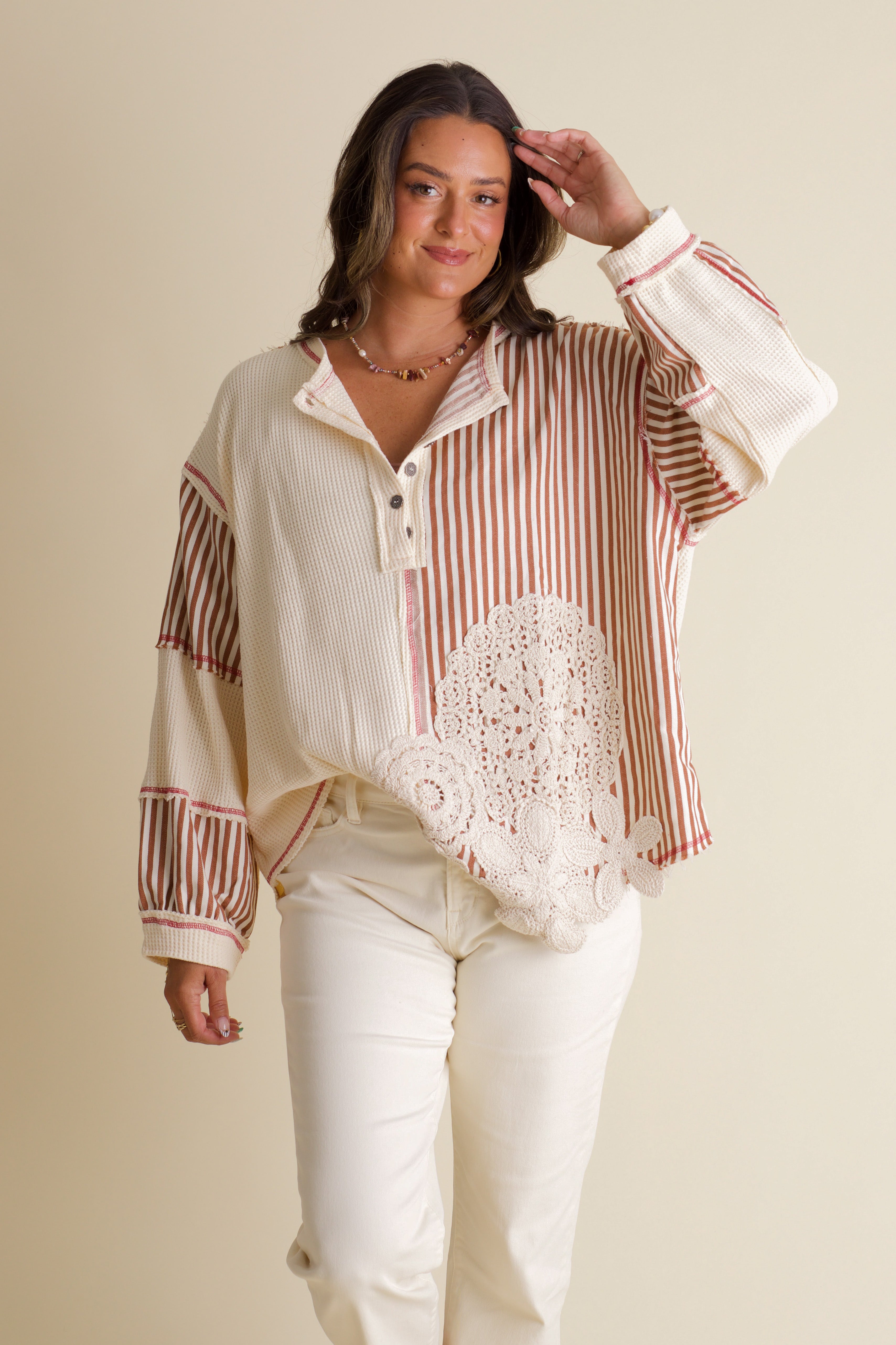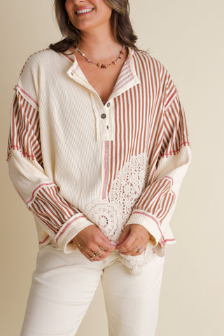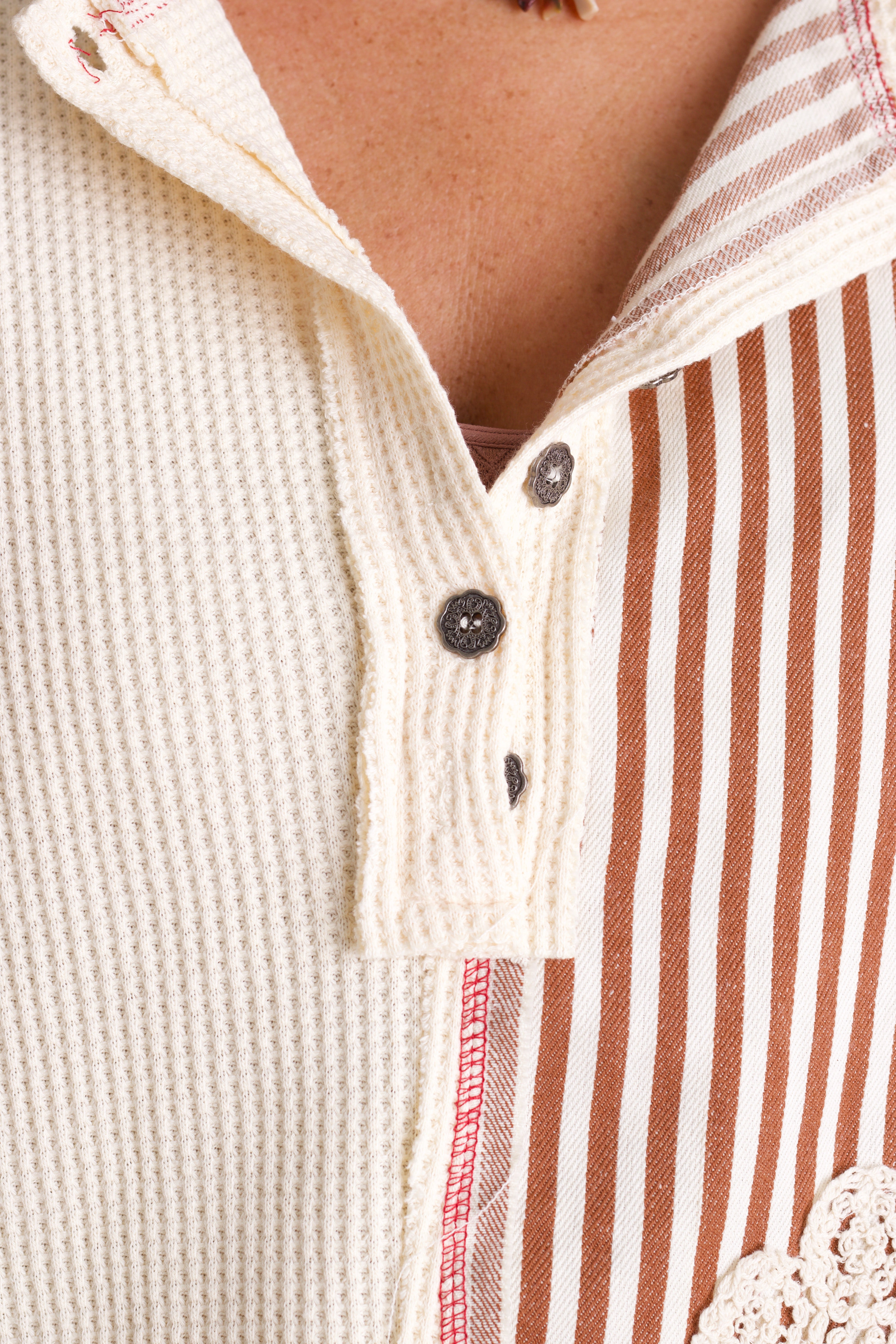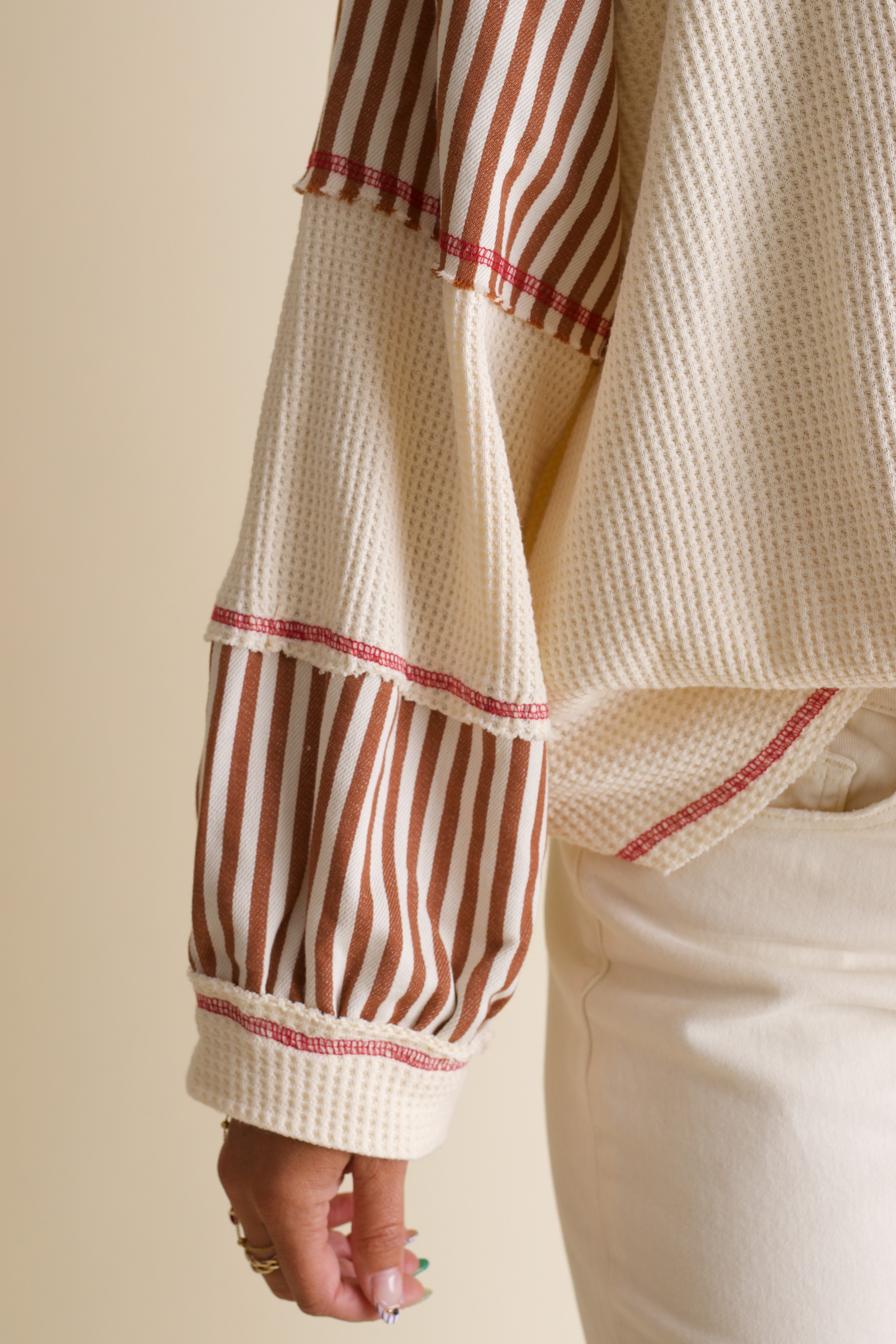 Get lost in style with our Lost In Time oversized thermal top! This color blocked striped and thermal Henley button top features reverse stitching, crochet details, and raw edge seams for a unique look. With balloon sleeves and an oversized fit, it's both comfortable and trendy. Limited stock and available in sizes small through large!