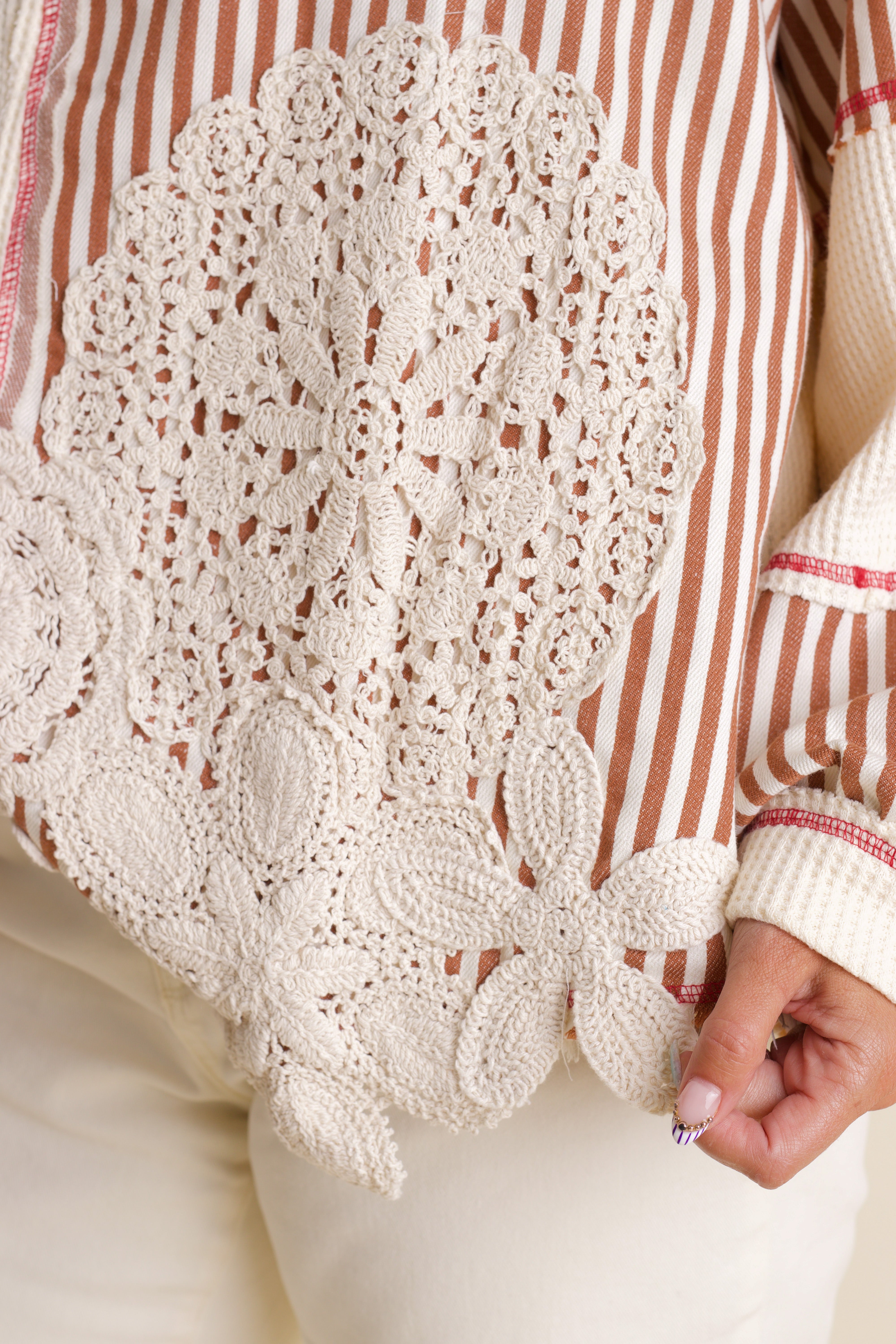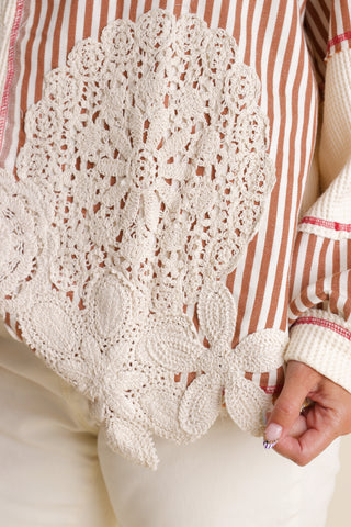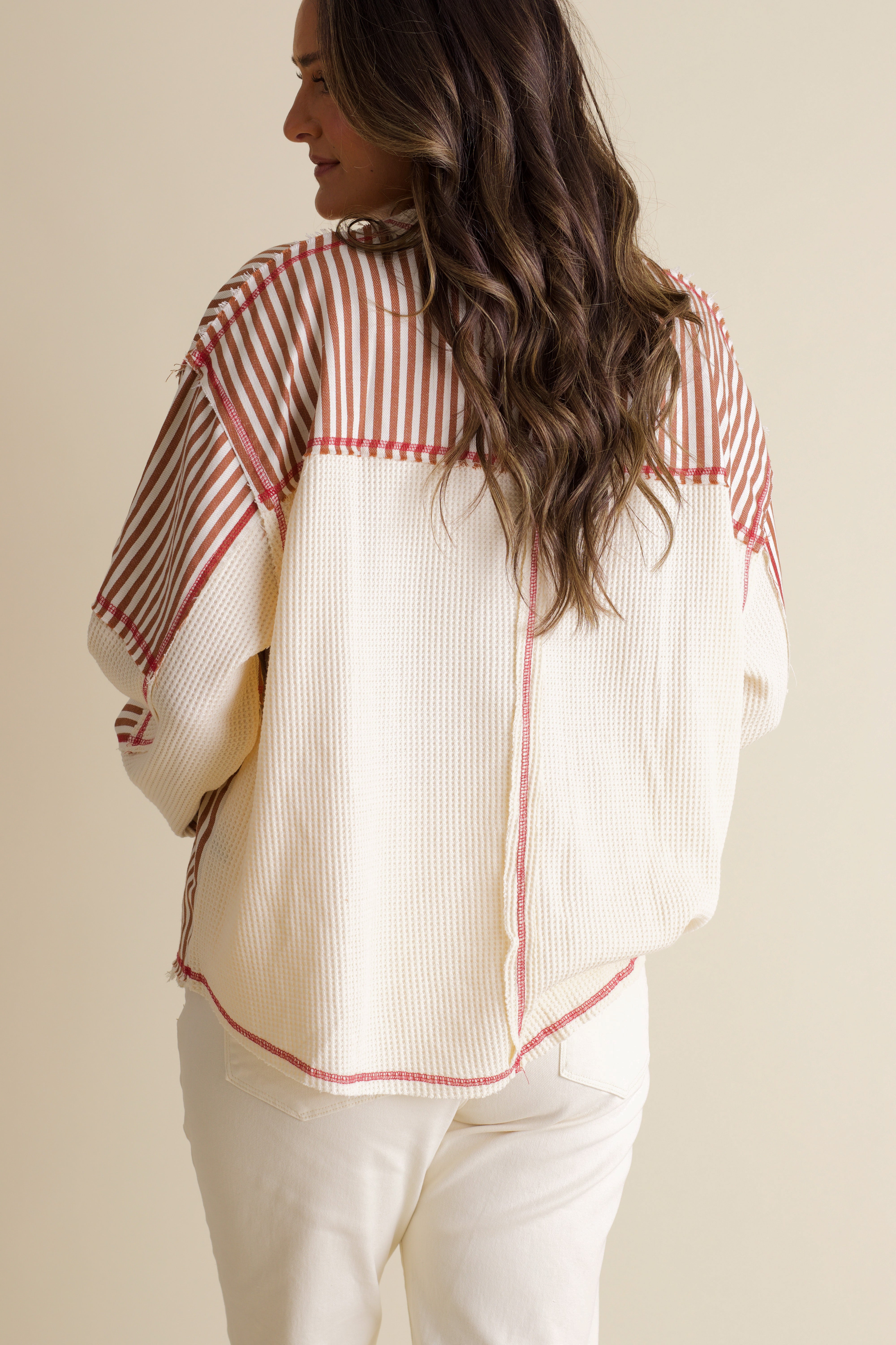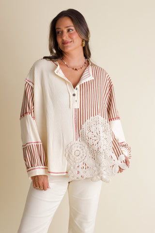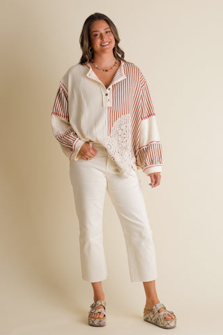 Get lost in style with our Lost In Time oversized thermal top! This color blocked striped and thermal Henley button top features reverse stitching, crochet details, and raw edge seams for a unique look. With balloon sleeves and an oversized fit, it's both comfortable and trendy. Limited stock and available in sizes small through large!
