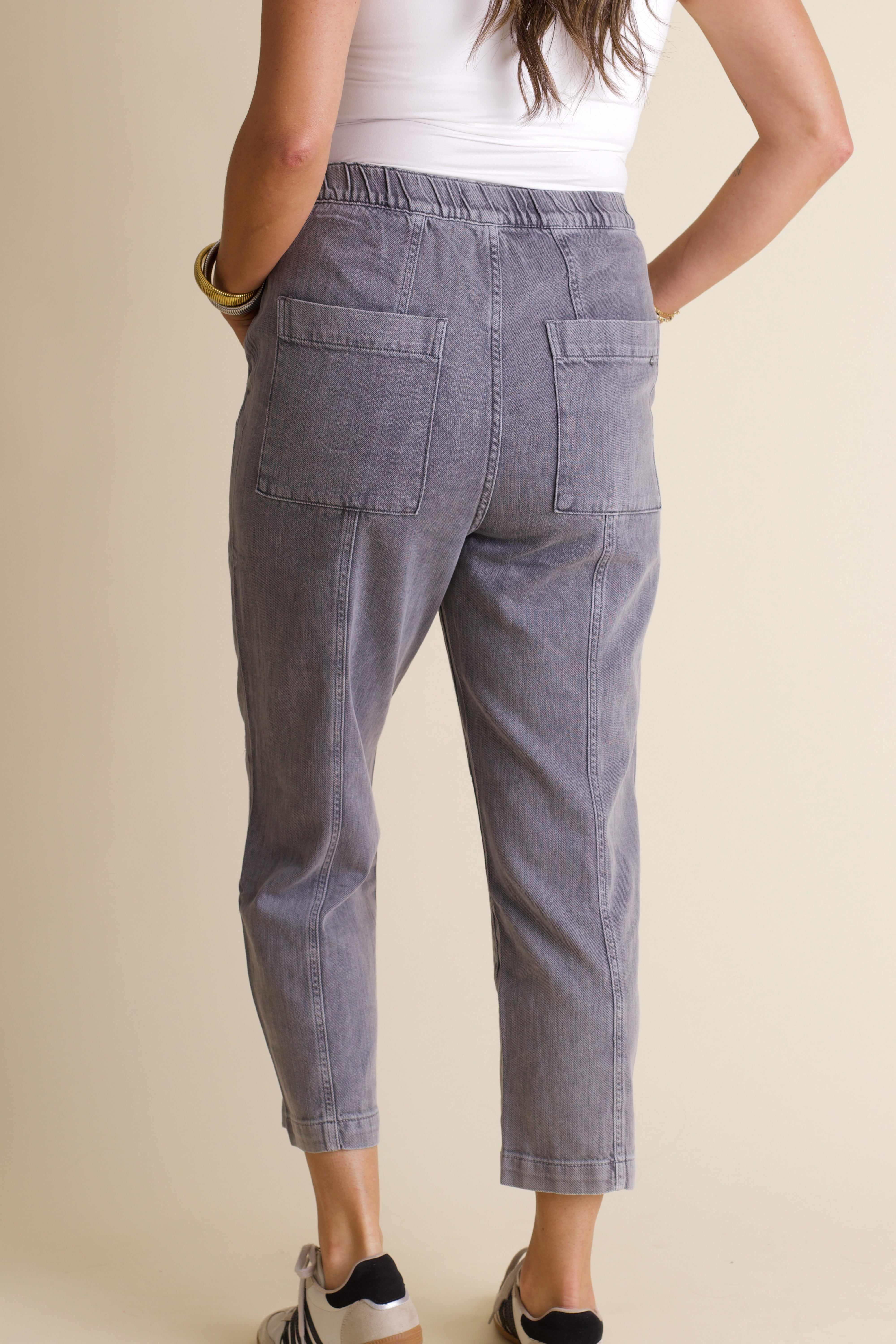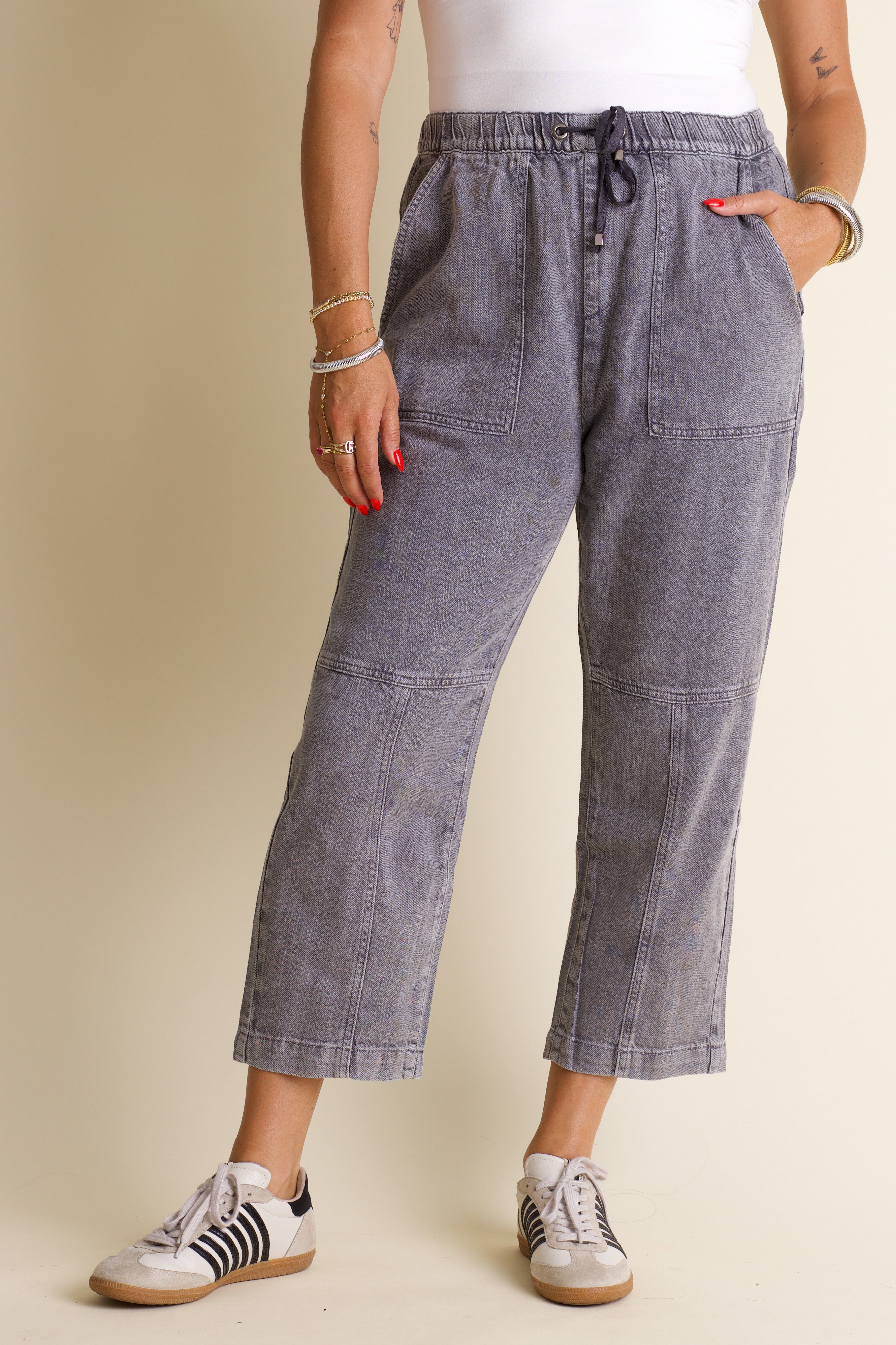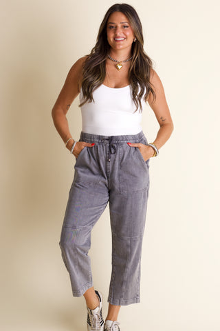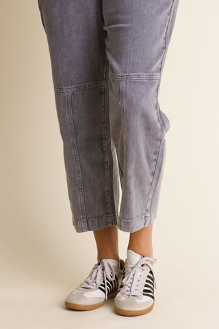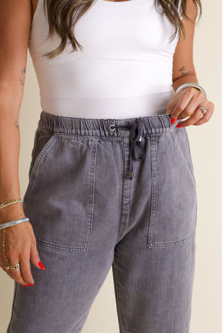 Slip into the Macie Super High Rise Joggers for a perfect blend of comfort and style. These soft washed gray jeans feature an adjustable elastic waist for a custom fit, roomy pockets, and a relaxed cropped silhouette that’s effortlessly cool. The unique “cool girl” seams add a playful edge, making these joggers your new go-to for laid-back days with a chic twist. Limited stock and available in sizes small through XL!