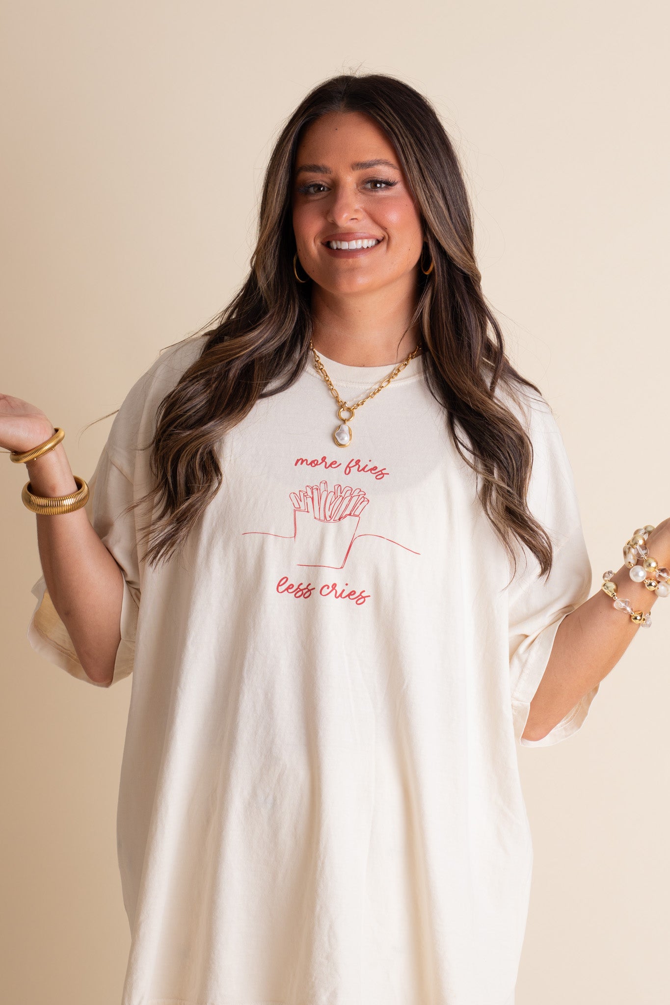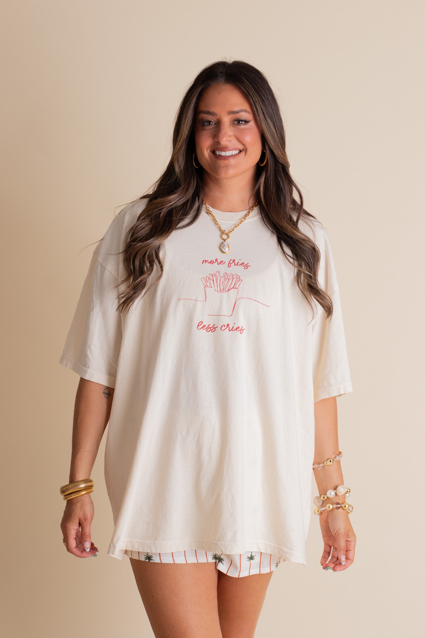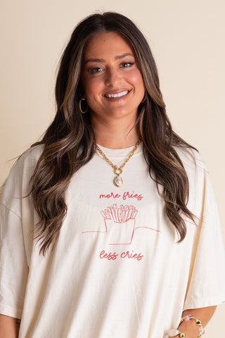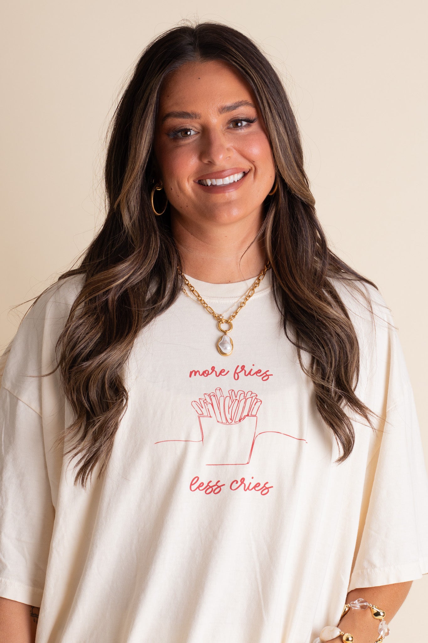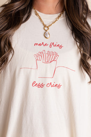 Enjoy a playful vibe with the More Fries, Less Cries Tee. This soft ivory Comfort Colors shirt is screen printed in-house with a bold red graphic, making it a cozy and cheerful addition to your casual wardrobe. Perfect for those who believe in more fries and fewer tears!