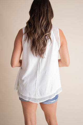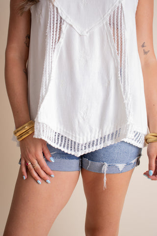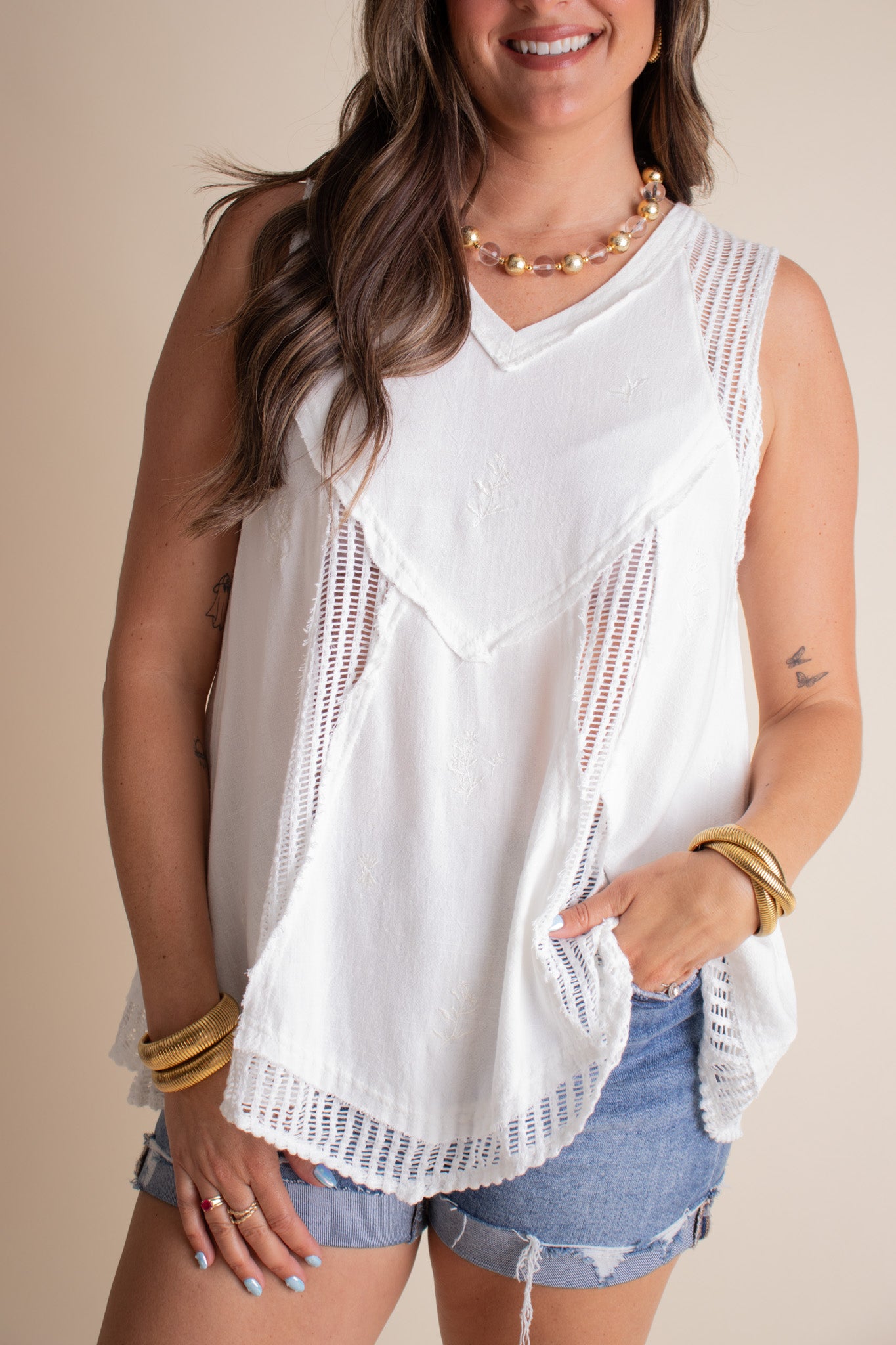 Embrace summer vibes with our Layered In Love Sleeveless Top! This playful cotton piece features delicate floral embroidery and dreamy crochet mesh details that catch the breeze. The raw edge seams add a touch of boho flair, while the flattering v-neckline and flowy fit ensure you'll stay cool and confident all day long. Perfect for layering or wearing solo on sunny adventures! Limited stock and available in sizes small through large!