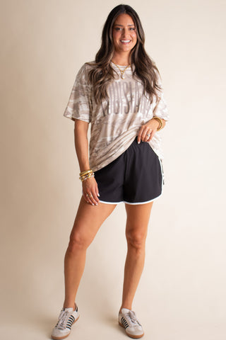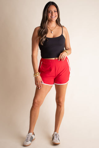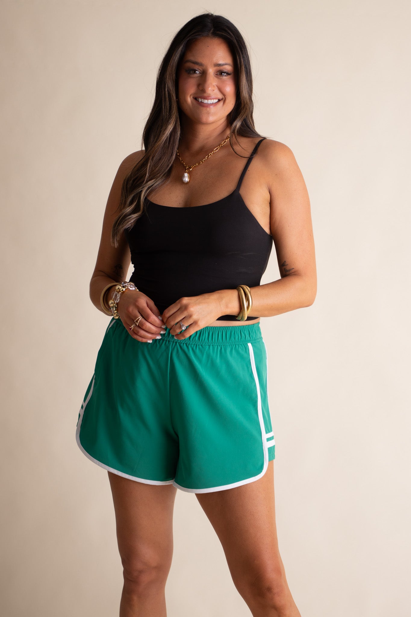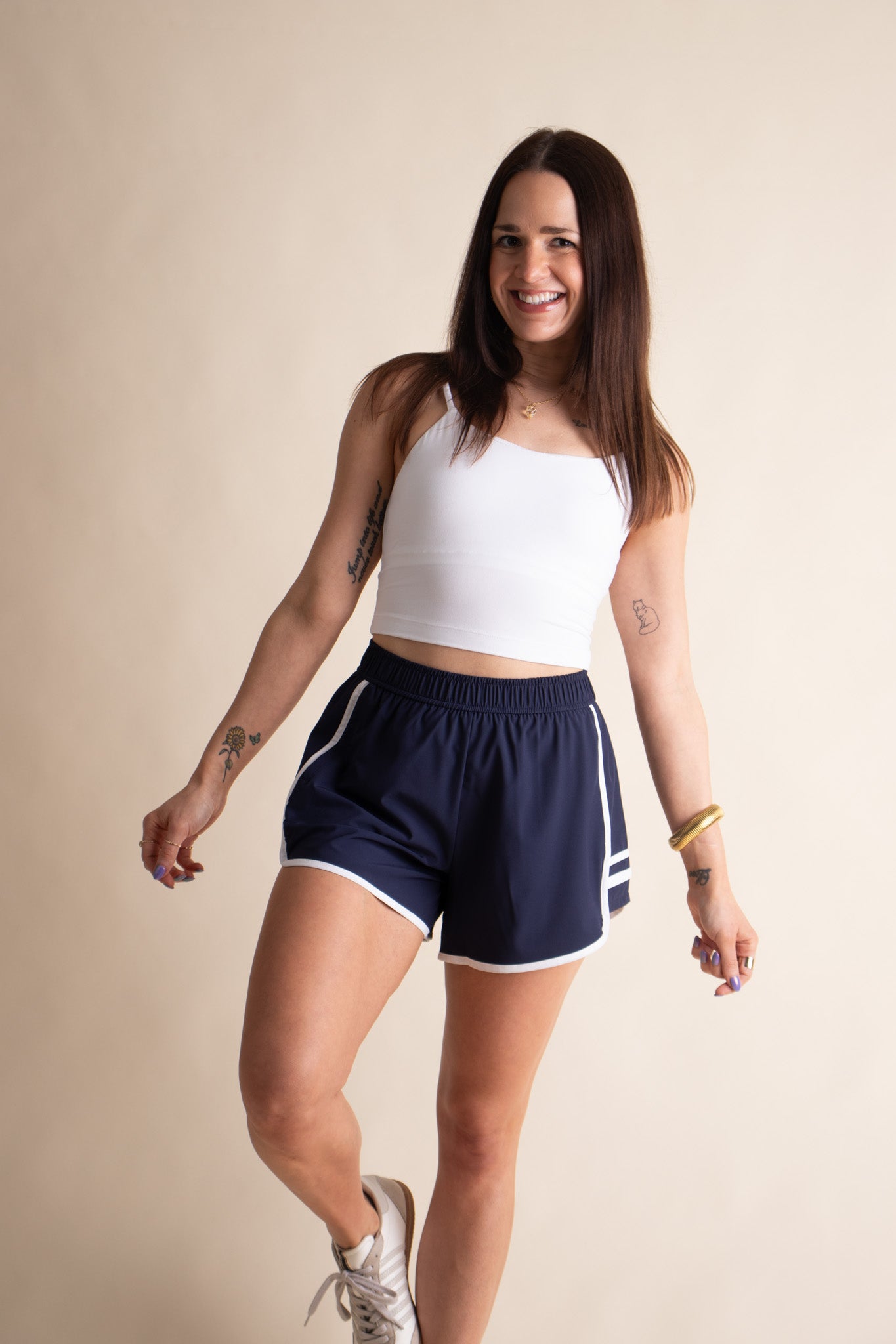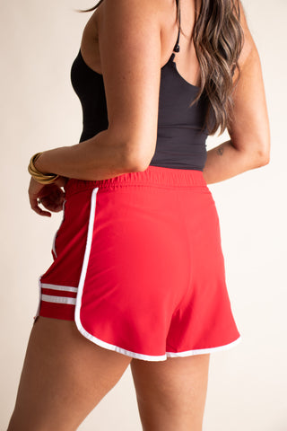 Rock your workout with our Work It Out Active Shorts! These high elastic waist shorts are made with a lightweight, sweat-wicking material to keep you feeling cool and dry. The contrasting trim features a stylish stripe design on the side and the dolphin hem  and a pocket on the right side adds a fun touch. Plus, with a built-in liner, you'll feel comfortable and confident. Available in 6 color options and sizes small through large!