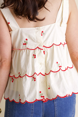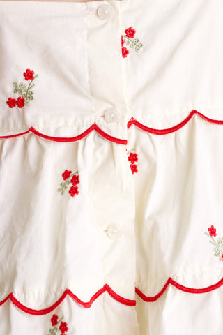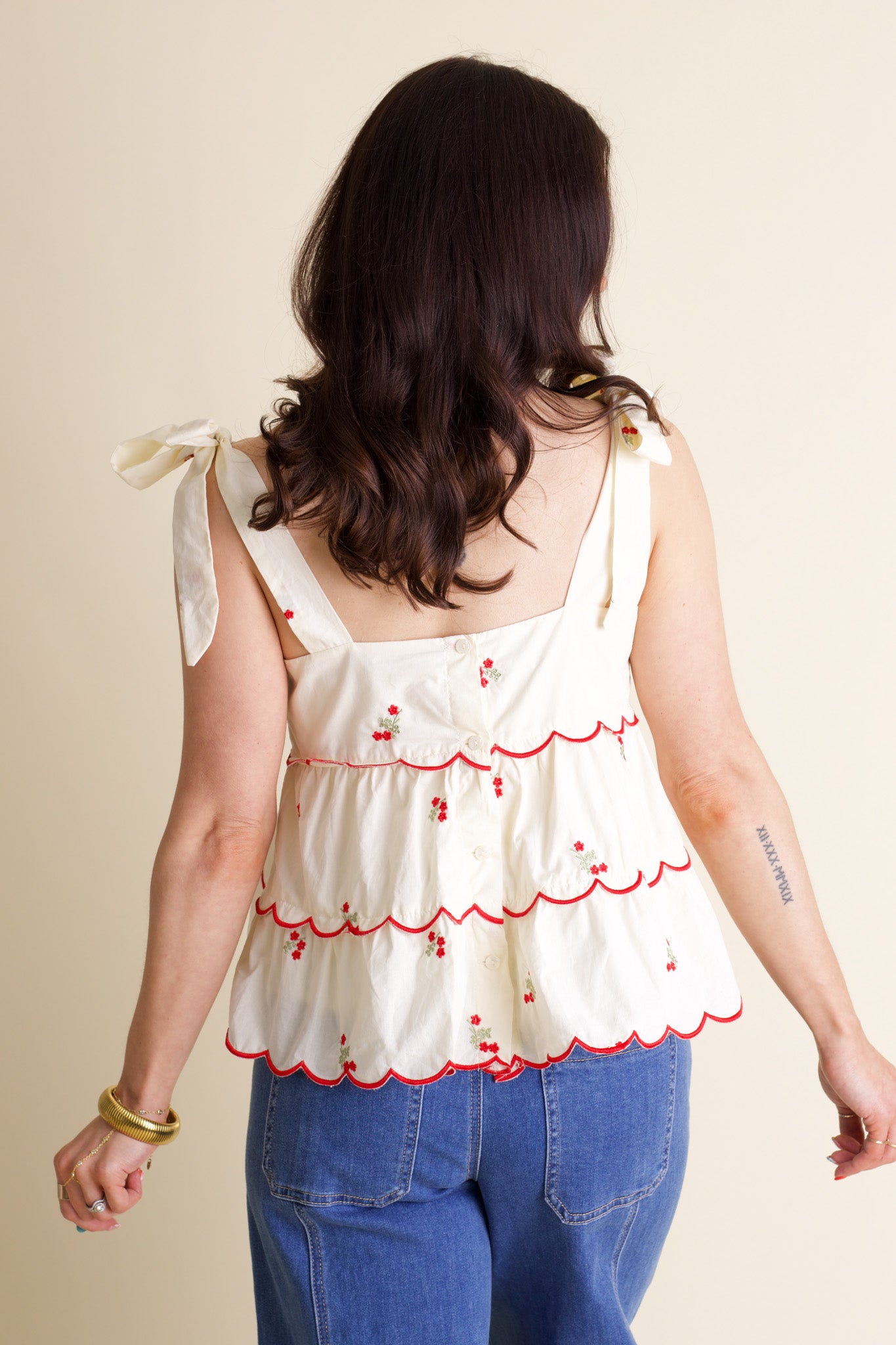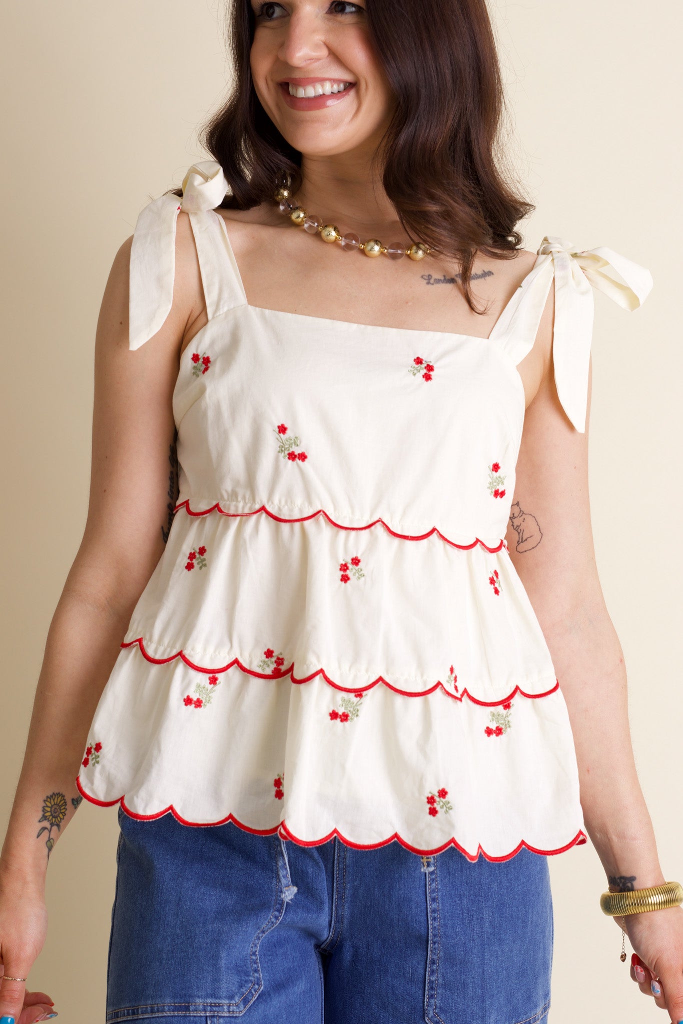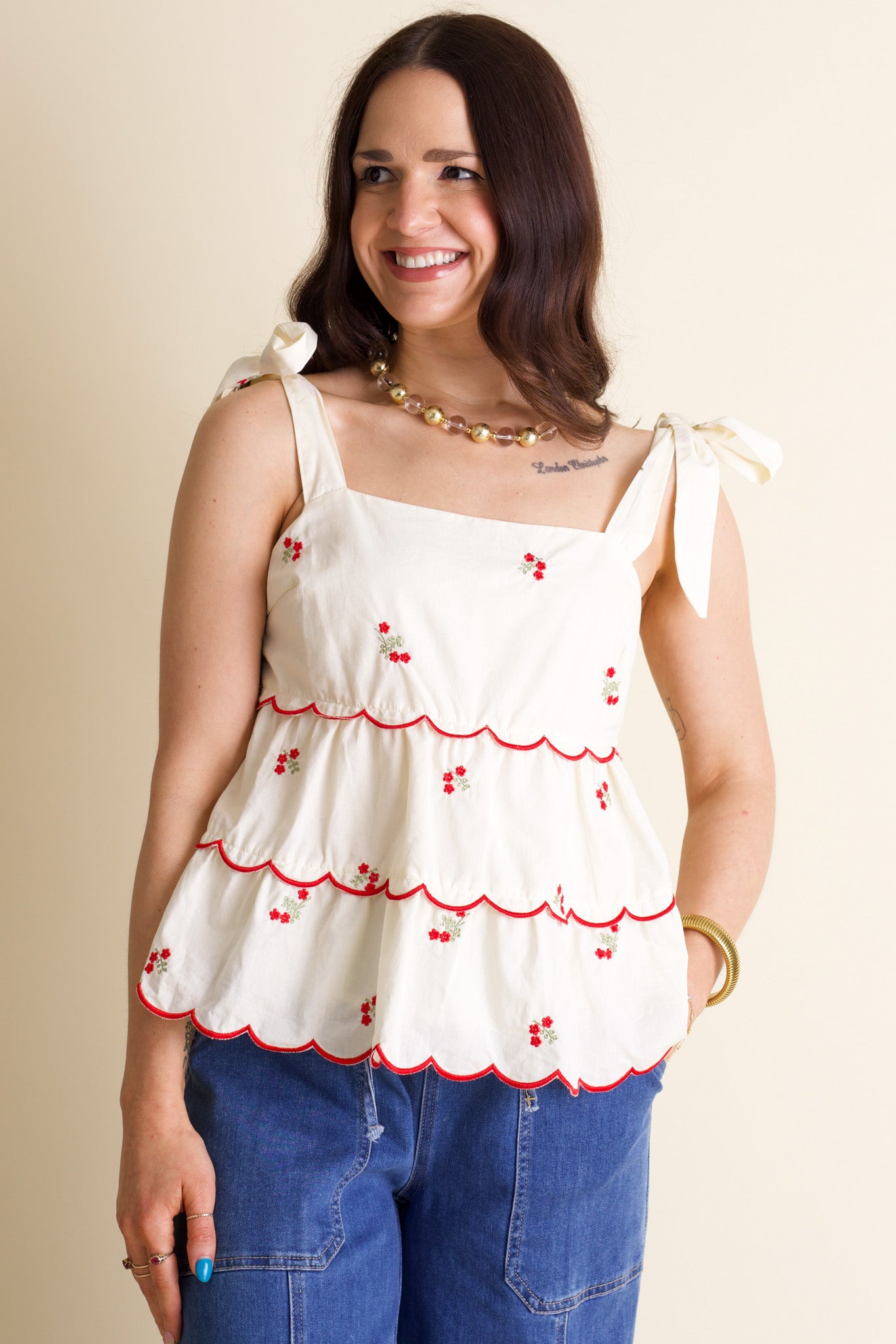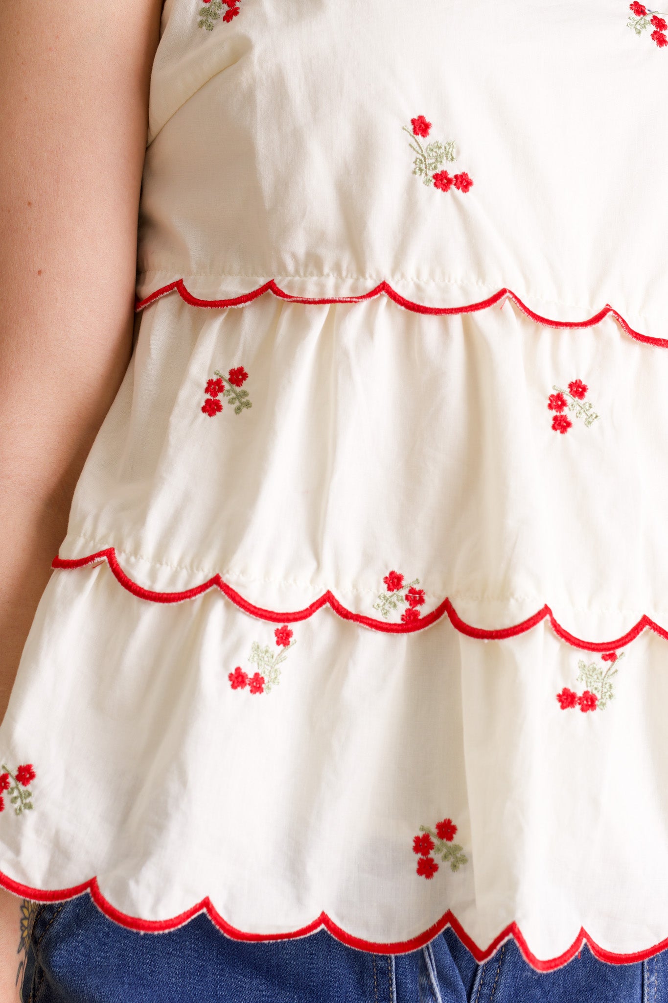 This cream tiered top bursts with charm, featuring vibrant red floral embroidery that adds a pop of color. Playful red ruffled trim and tied sleeves bring a flirty, feminine touch, making it perfect for sunny days and casual outings. Light and breezy, it’s designed to keep you comfortable while turning heads wherever you go. Limited stock and available in sizes small through XL!