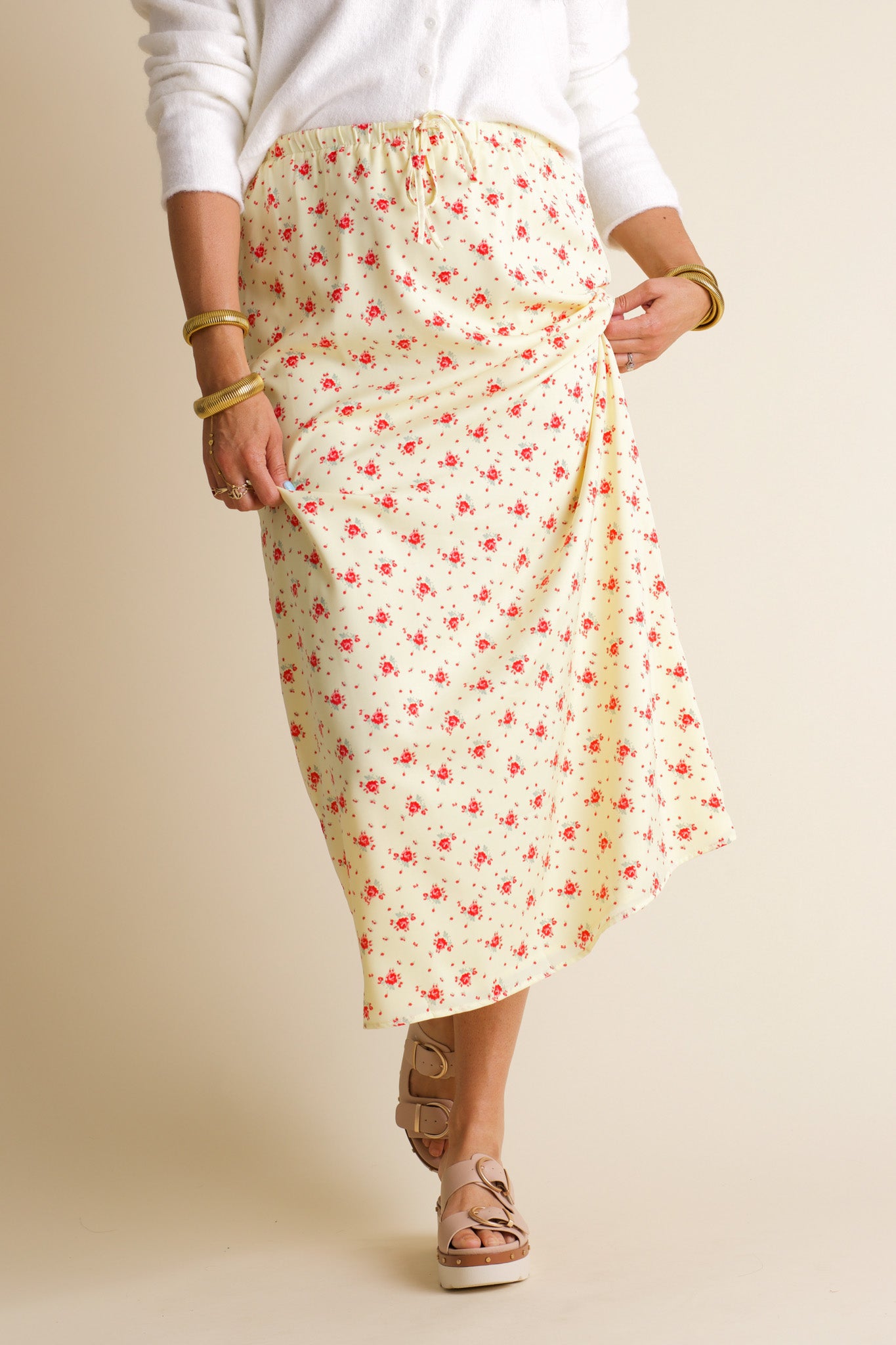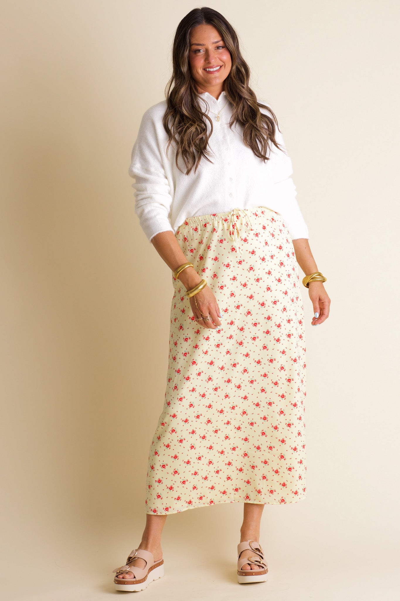 Experience endless sunny days with our Sweet Memories Floral Maxi Skirt! This stunning skirt features a vibrant yellow and red floral print, with an elastic tied waist for both comfort and style. Radiate positive vibes wherever you go in this playful and versatile piece. Limited stock and available in sizes small through large!