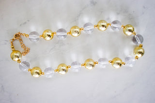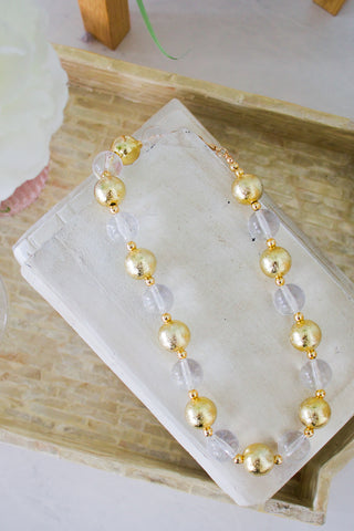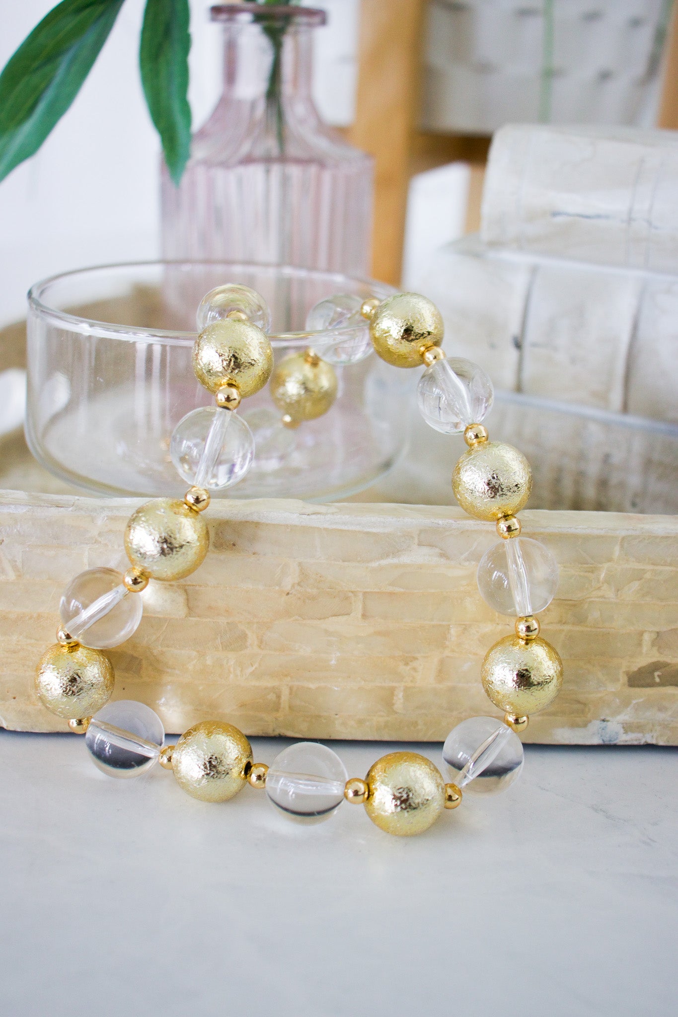 Cue the confetti- The Party Is Here Necklace brings the celebration wherever you go! Featuring dazzling gold-flecked beads and sleek clear accents, this bold beauty lights up every outfit with instant sparkle and fun. Whether your dressing up or keeping it casual, this necklace says it out loud: the party has officially arrived.