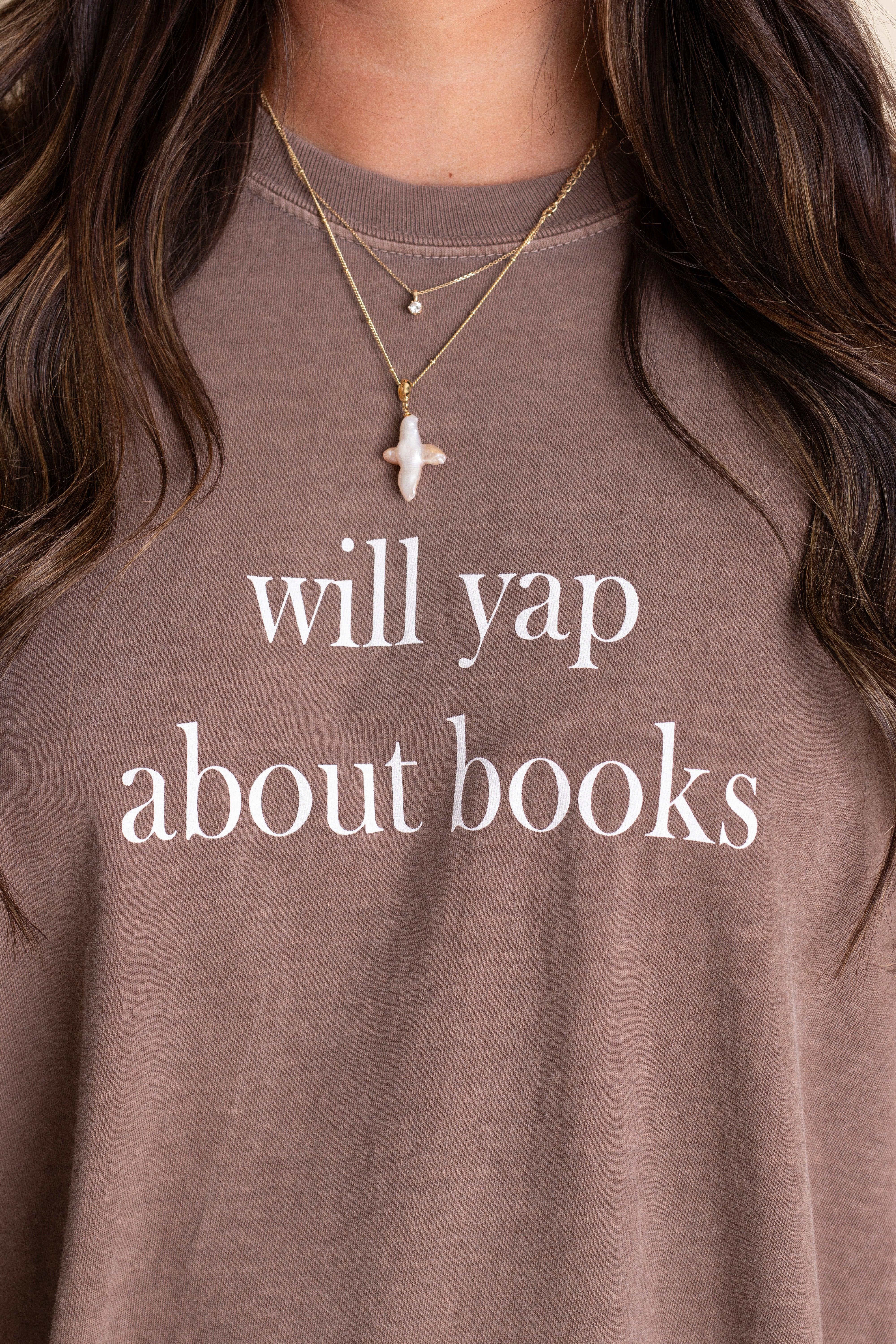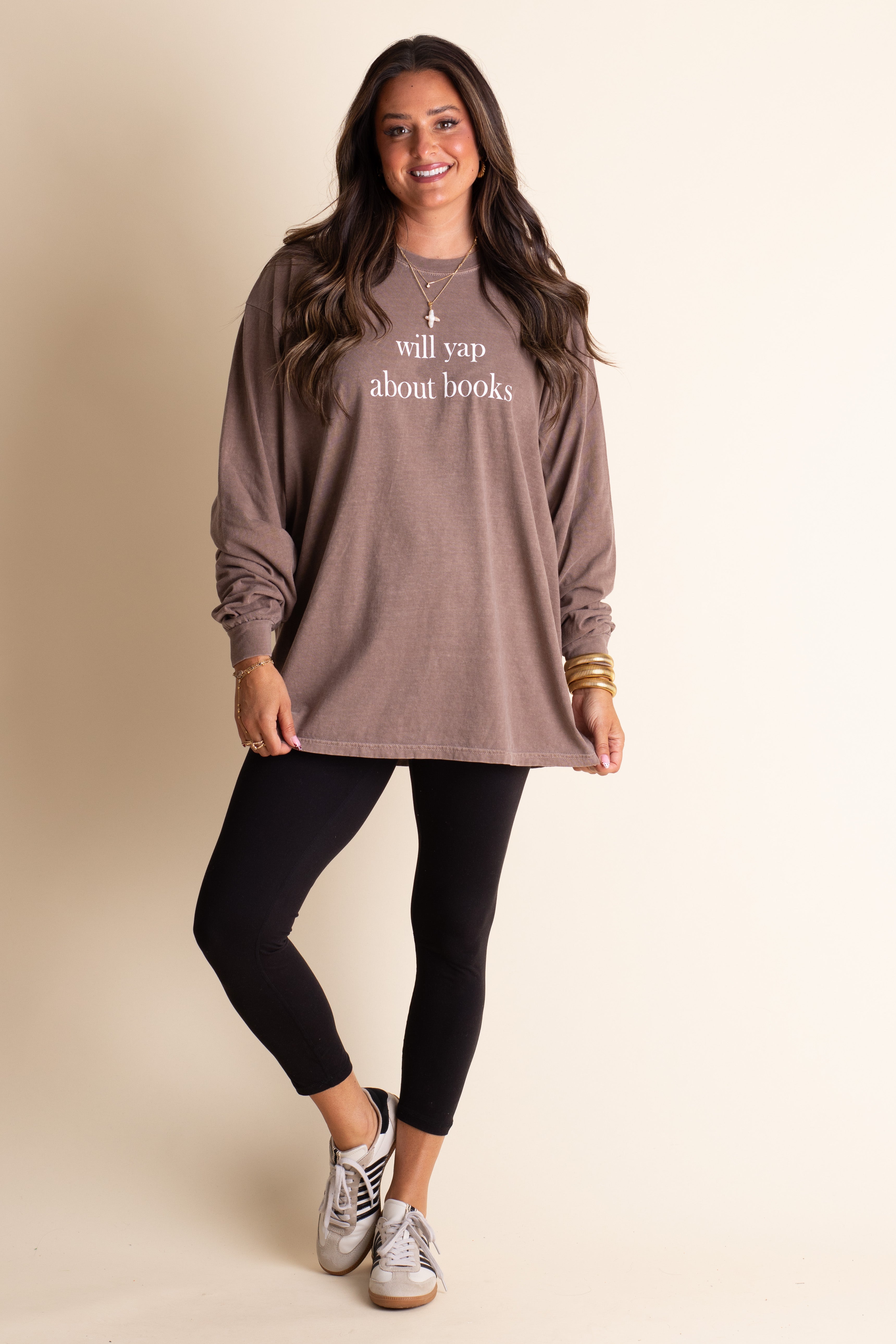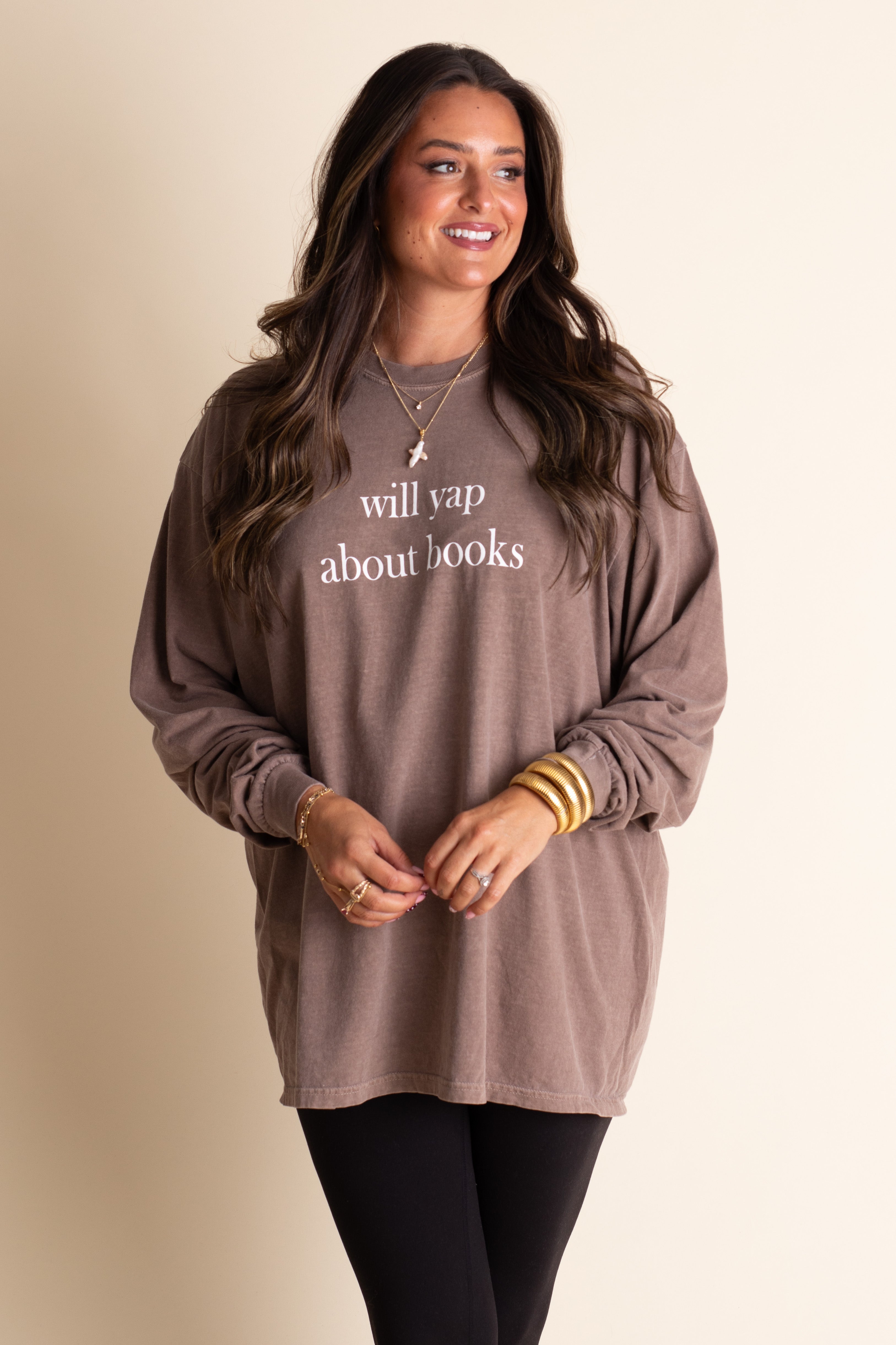 Show off your love for books with the Yap About Books Long Sleeve Tee! This cozy espresso-colored comfort colors tee features a bold white "Will Yap About Books" graphic screen printed right here in-house. Perfect for book lovers who can’t stop chatting about their latest reads, it’s a fun and comfy way to wear your passion on your sleeve—literally!